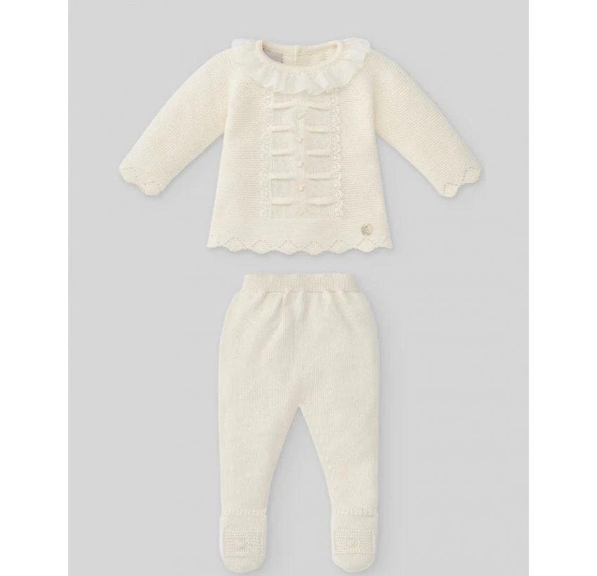 Set Paz Rodrรฌguez in lana per neonato; maglia con scollo rotondo, chiusura posteriore con bottoni e pantaloni morbidi in maglia liscia con piede.