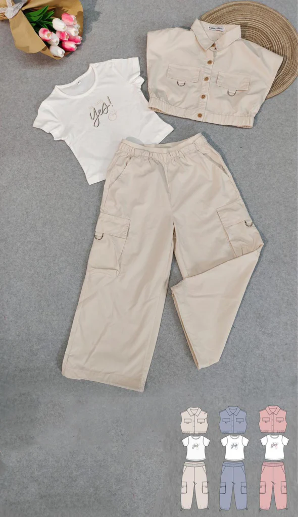 Completo da bambina 3 pezzi. T-shirt girocollo con scritta “yes”. Gilet corto cropped con colletto, bottoni e elastico in vita. Pantaloni cargo con tasconi e elastico in vita. Disponibile in diversi colori.