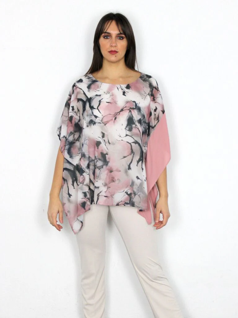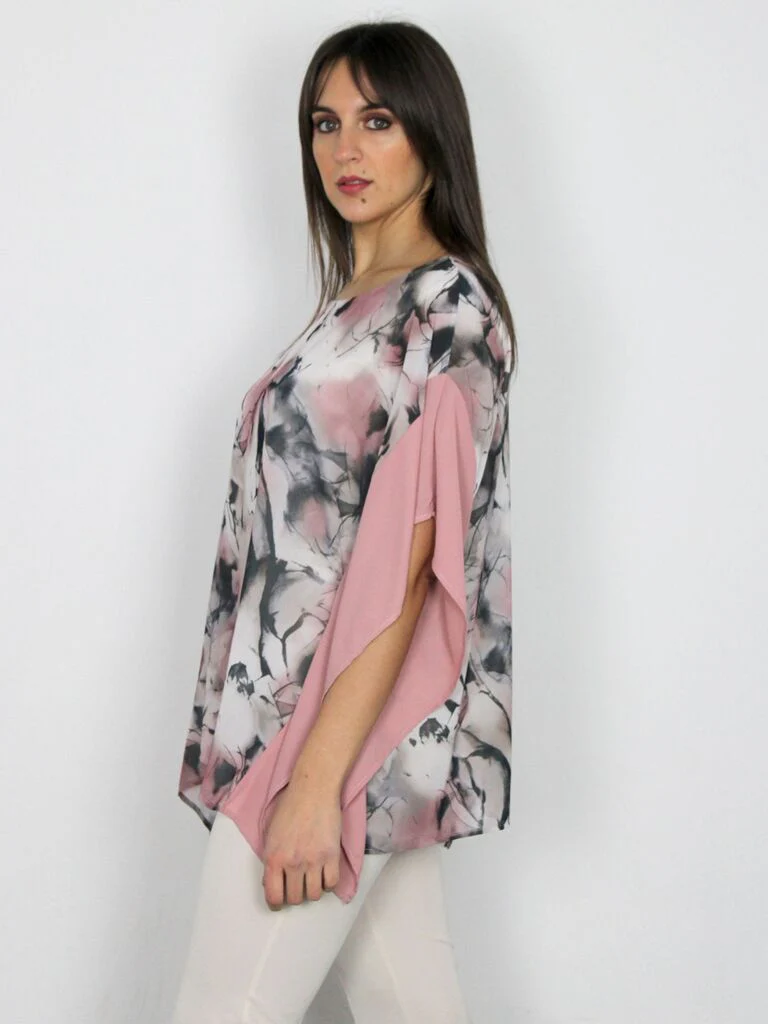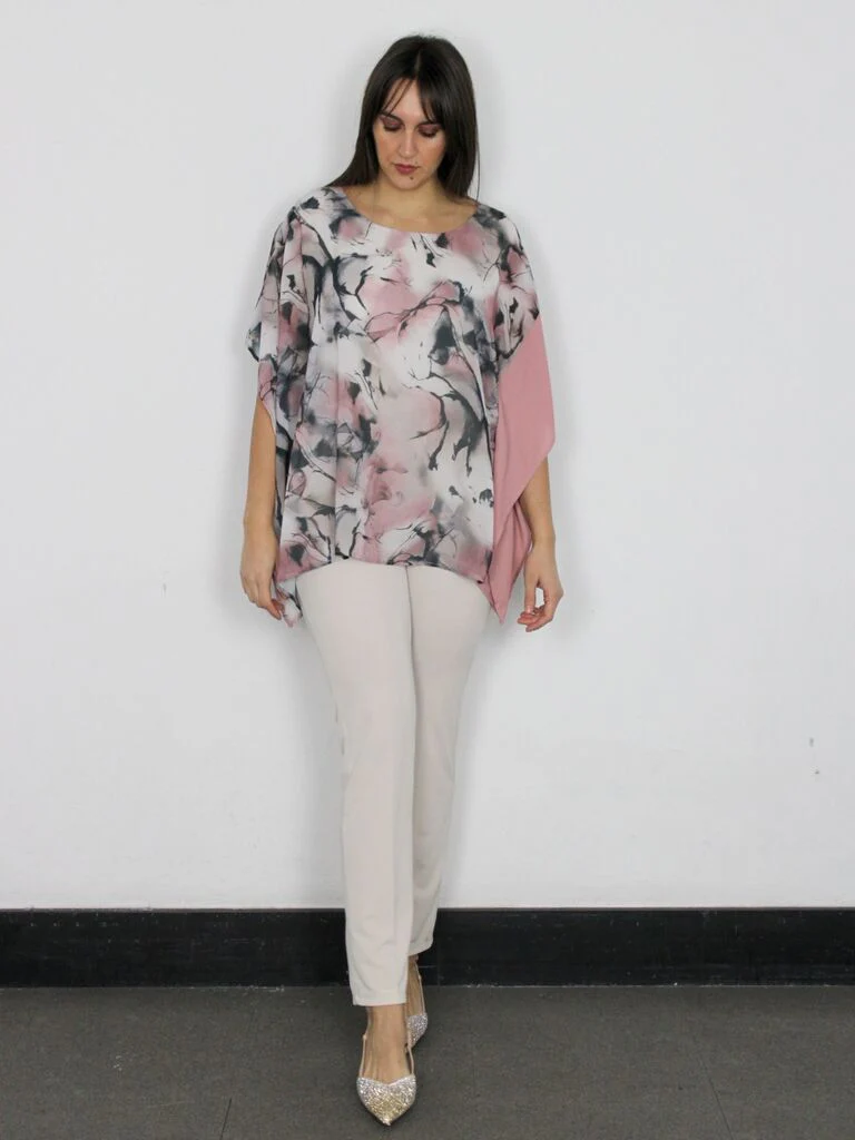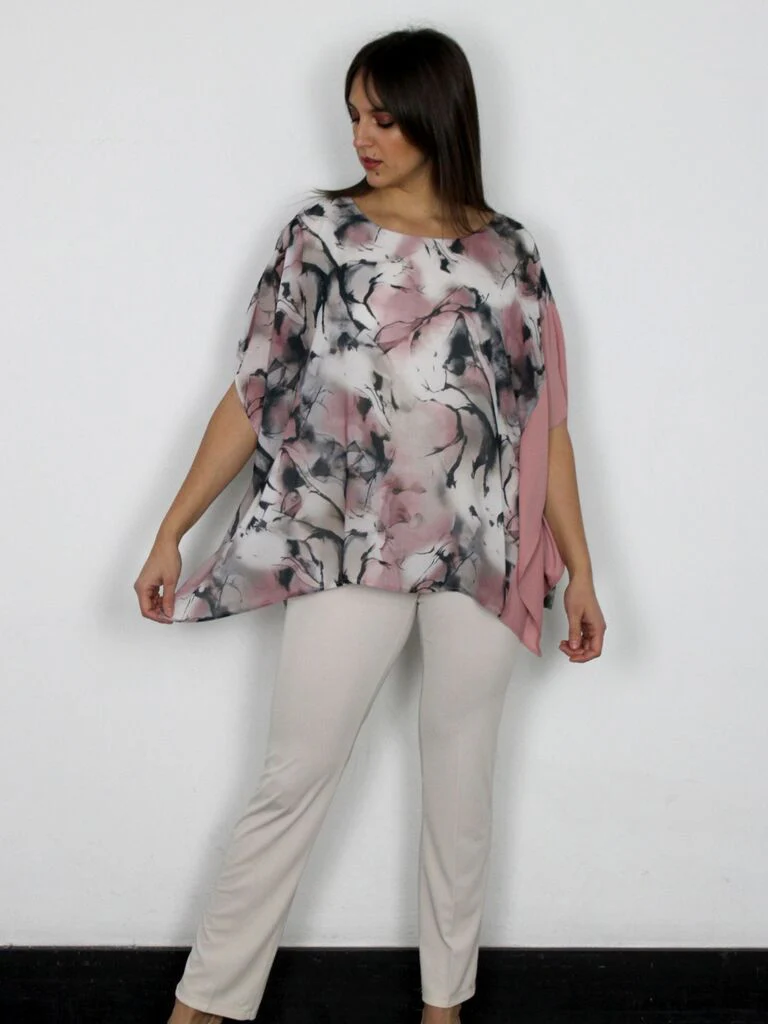 Coordinato composto da casacca floreale con bordo unito e spacco, doppio tessuto, sotto tinta unita e sopra tessuto in fantasia. Pantalone da infilate tinta unita, morbido