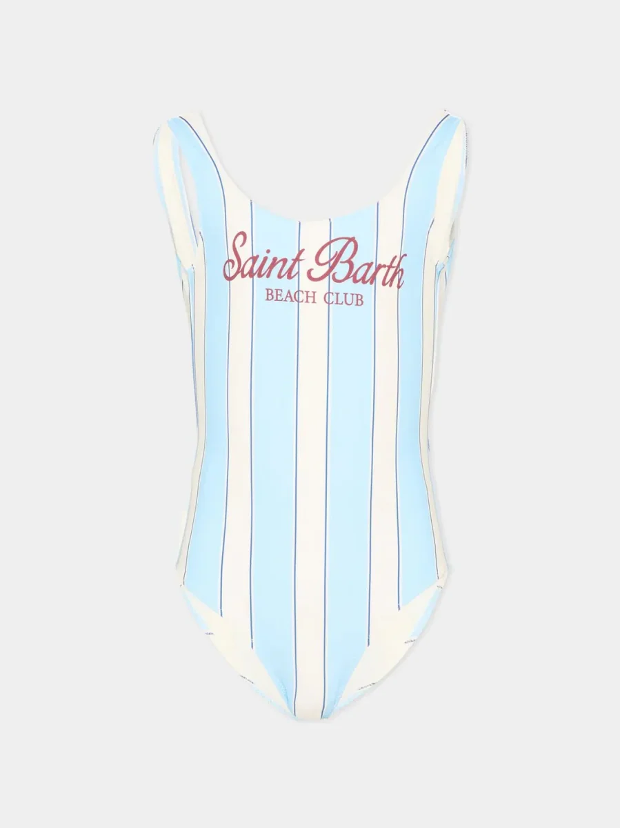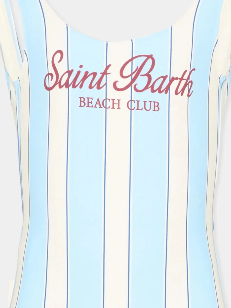 Costume intero cara MC2 Saint Barth in tessuto tecnico liscio con righe verticali azzurre e bianche dal gusto beachwear. Presenta il logo Saint Barth con scritta โBeach Clubโ sul davanti in contrasto rosso, mentre il retro presenta una profonda scollatura a V con piccola etichetta logata applicata al centro. Spalline ampie e sgambatura moderata assicurano […]