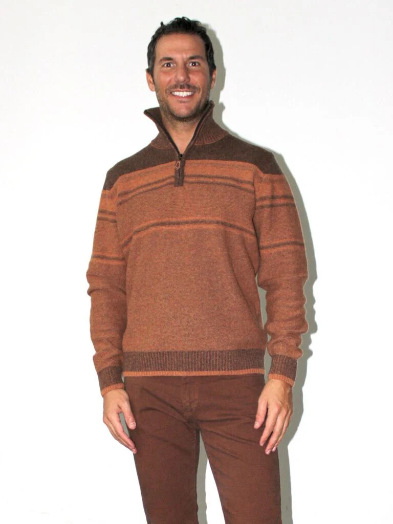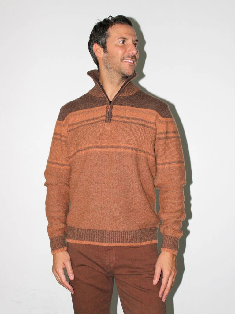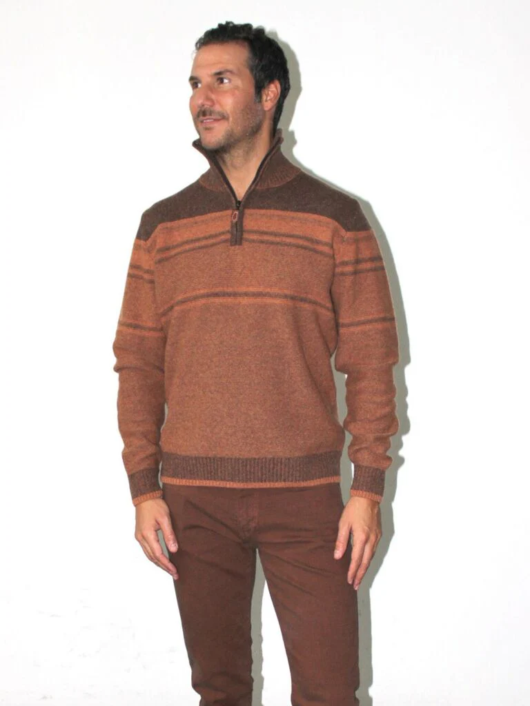 DESCRIZIONEDolcevita con mezza zip, effetto degradè e profili a costeComposizione: 60% lana, 20% poliammide, 15% viscosa, 5% altre fibreCodice prodotto: 246547
