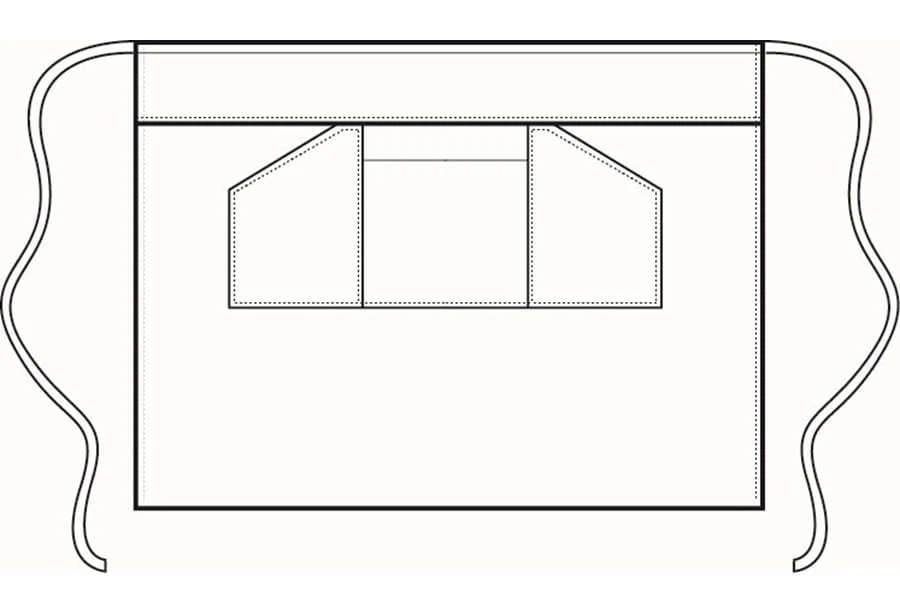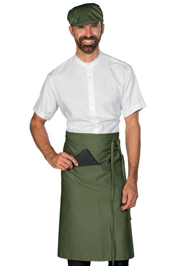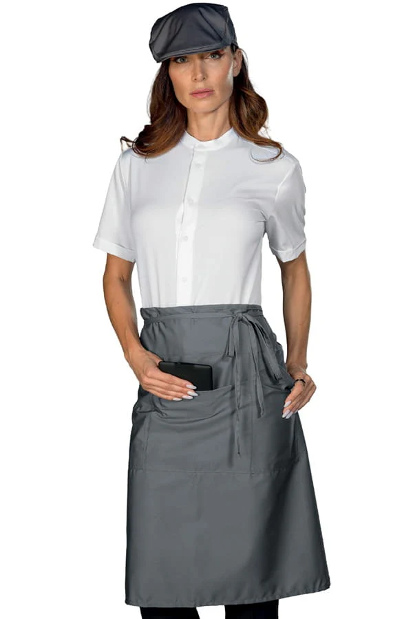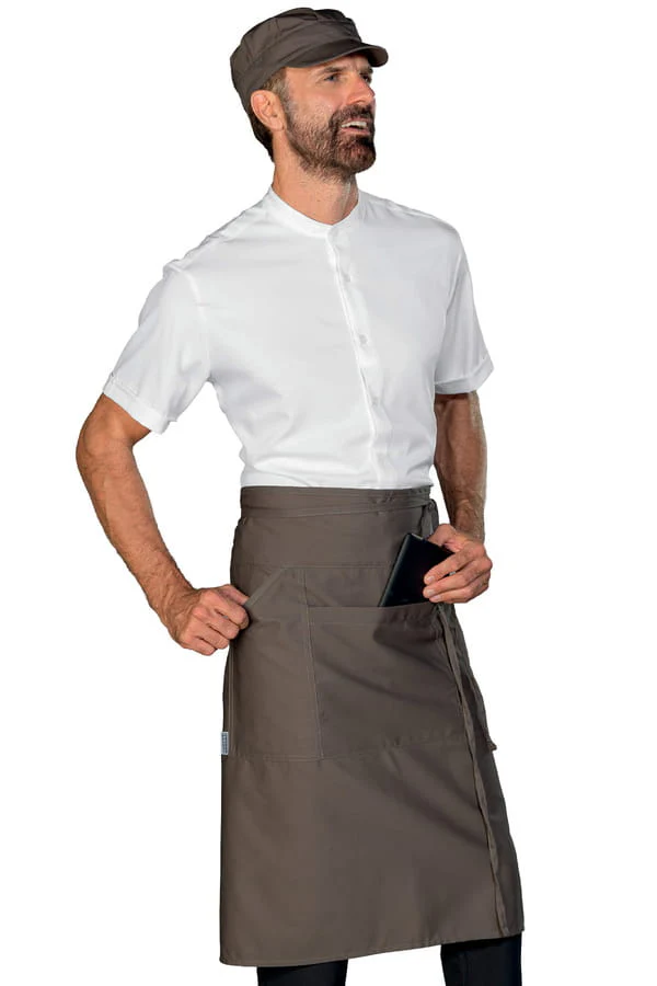 Grembiule con 2 tasche laterali e porta tablet centrale. Molto pratico per blocchetti comande e dispositivi elettronici di rilevamento ordini, penne, tablet e cassa. Ha una fettuccia larga e lunga. Realizzato in tessuto 65% Polyester e 35% Cotone assorbente.