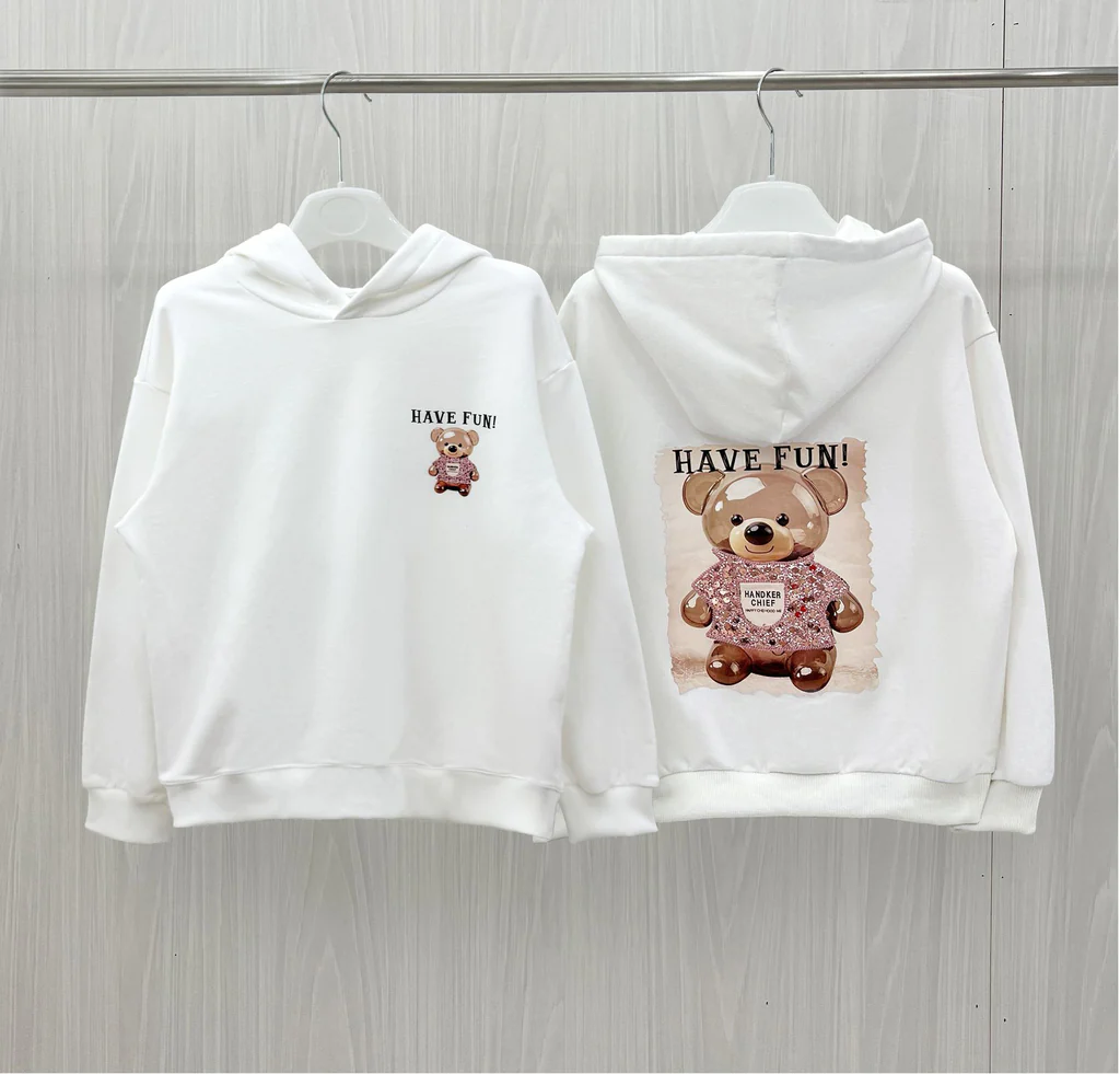 DESCRIZIONE: Felpa con cappuccio, dal design casual e divertente. Decorata con la scritta โ€œHAVE FUN!โ€ e stampa orsetto sul petto, presenta una maxi stampa dello stesso motivo anche sul retro. Un capo comodo e trendy, perfetto per il tempo libero.CODICE PRODOTTO: 260583