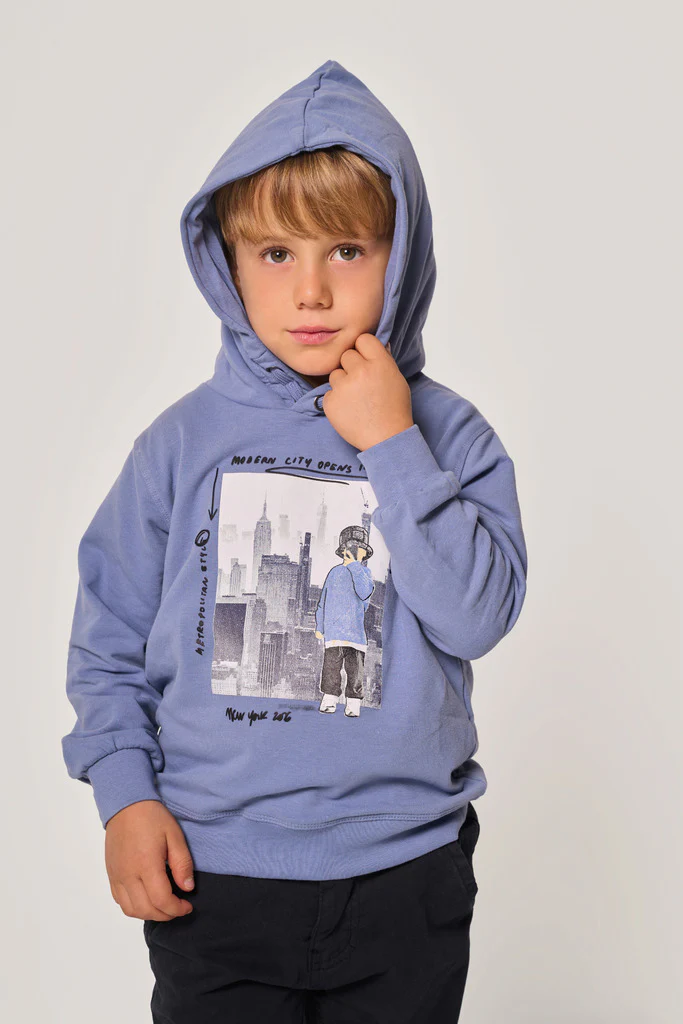 Felpa casual in morbido cotone, ideale per la stagione autunnale e invernale. Il modello presenta cappuccio fisso, maniche lunghe e stampa grafica frontale ispirata allo stile metropolitano, con scritta โModern City Opensโ.