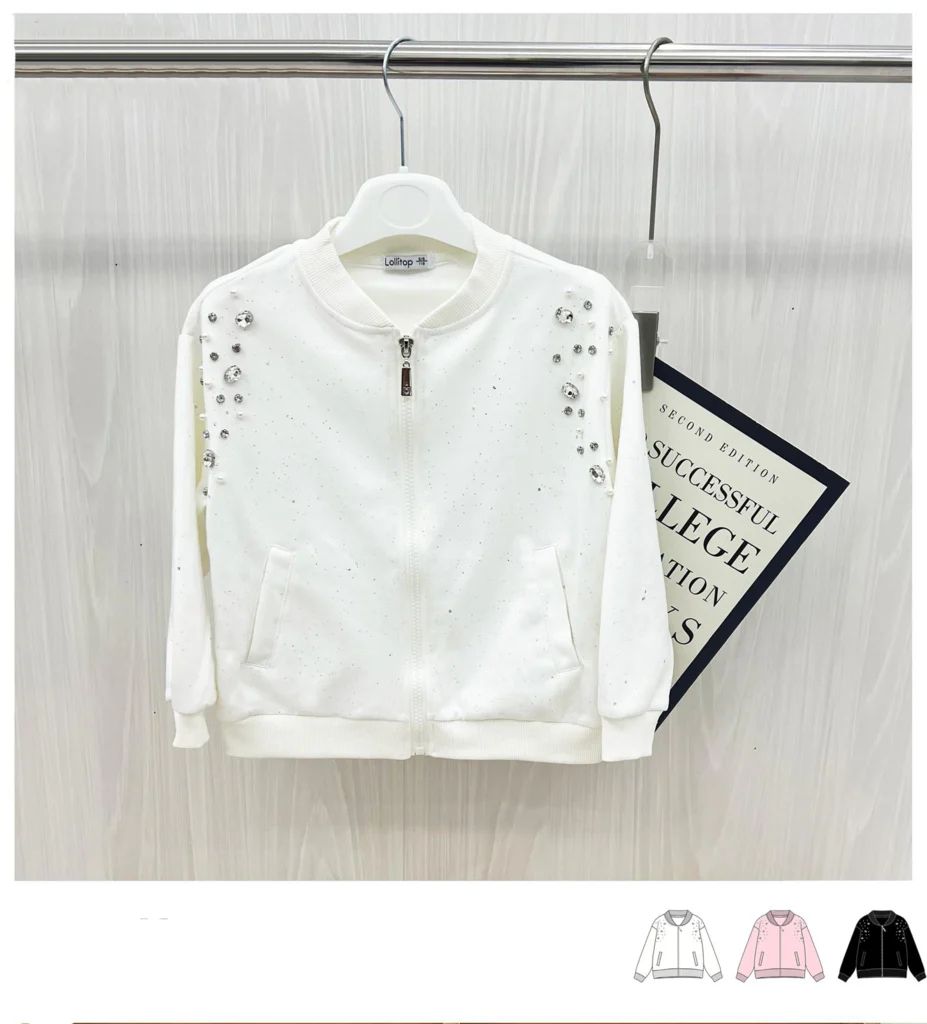 Felpa da bambina con brillantini, strass, zip e tasche oblique. Elastici in vita e ai polsi. Disponibile in diversi colori.