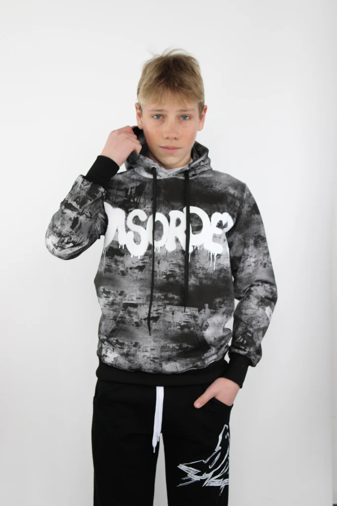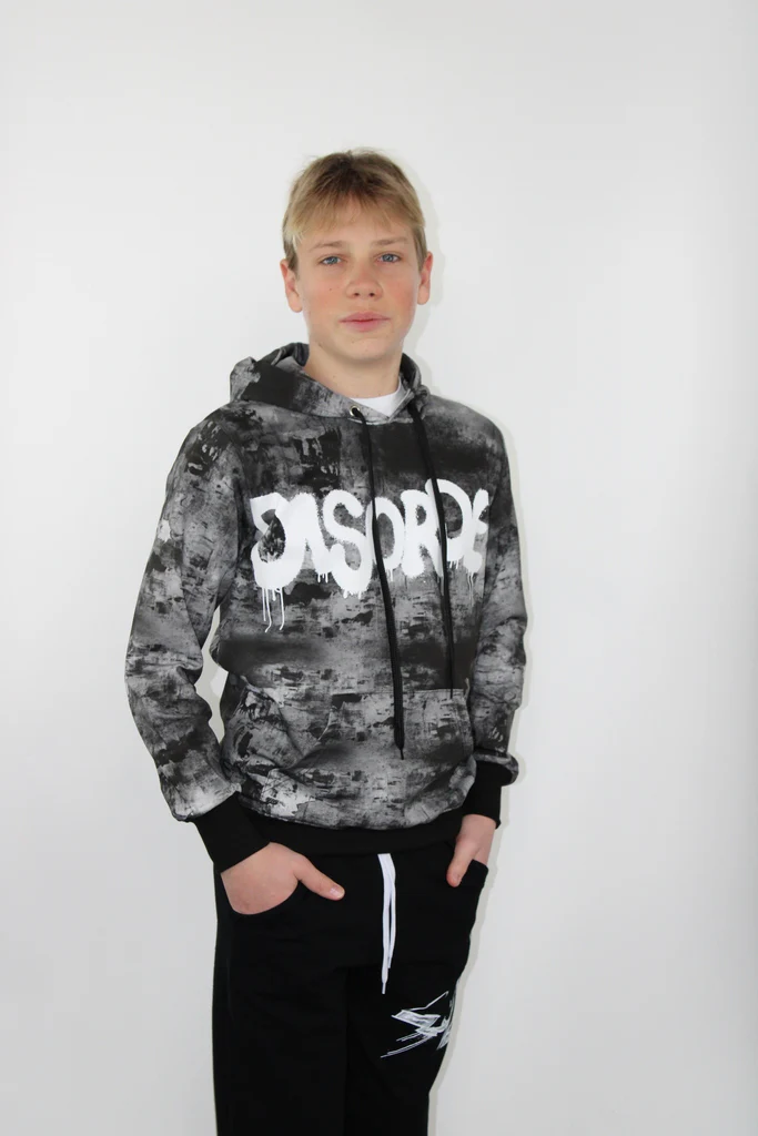 Felpa da bambino con cappuccio, tasche laterali, fantasia e colori grigio-neri, elastico in vita e ai polsi, scritta “disorder” frontale al centro.