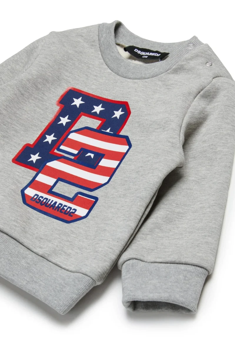 Felpa girocollo a maniche lunghe. Stampa D2 USA in stile college sul davanti a contrasto colore. Pratica chiusura con bottoncini sulla spalla. Lavorazione a costine su girocollo, polsini e fondo. Realizzata in 100% cotone.