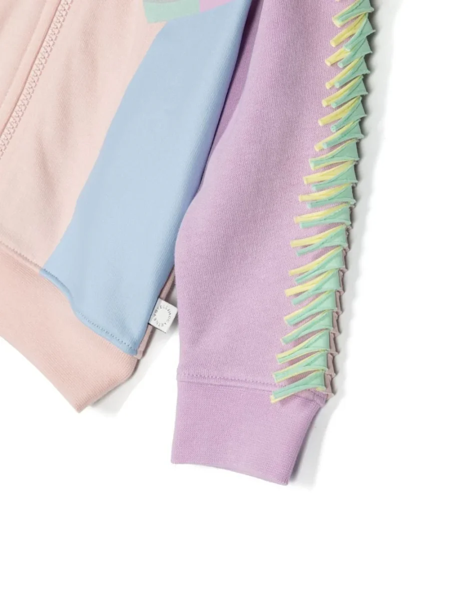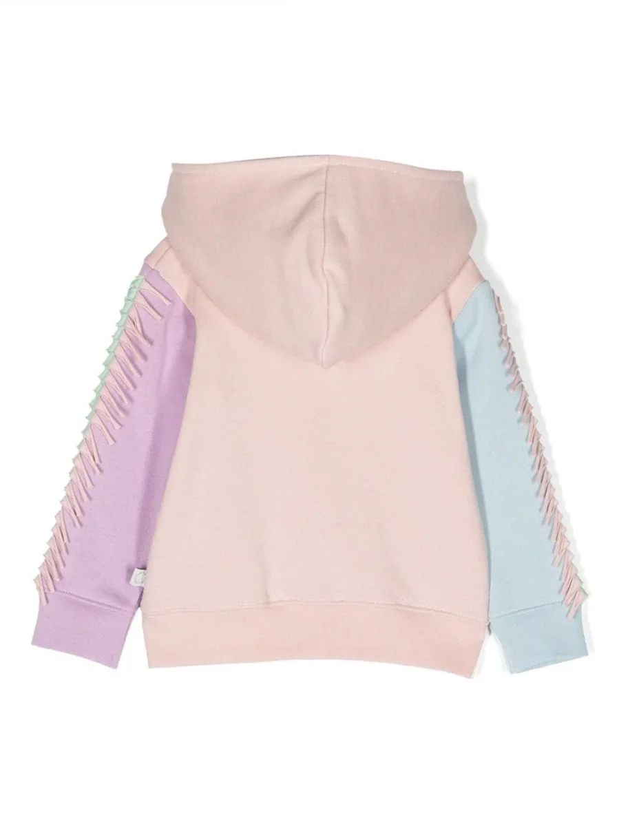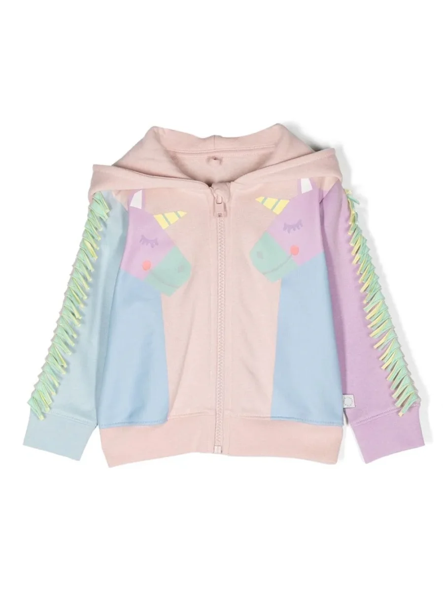 QUESTA FELPA CON ZIP E CAPPUCCIO PER NEONATA FIRMATA STELLA MCCARTNEY KIDS ร REALIZZATA IN JERSEY DI COTONE BIOLOGICO ROSA, SFOGGIA FRANGE LUNGO LE MANICHE E UN UNICORNO DOPPIO ARCOBALENO CELESTE E LAVANDA SUL DAVANTI. POLSINI E ORLO ELASTICIZZATI. COTONE PROVENIENTE DA FONTI RESPONSABILI E CERTIFICATO GOTS.