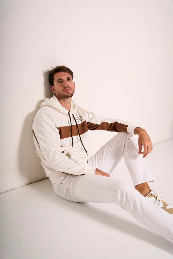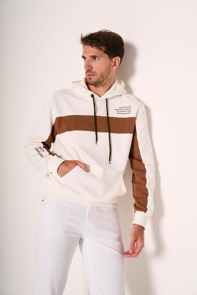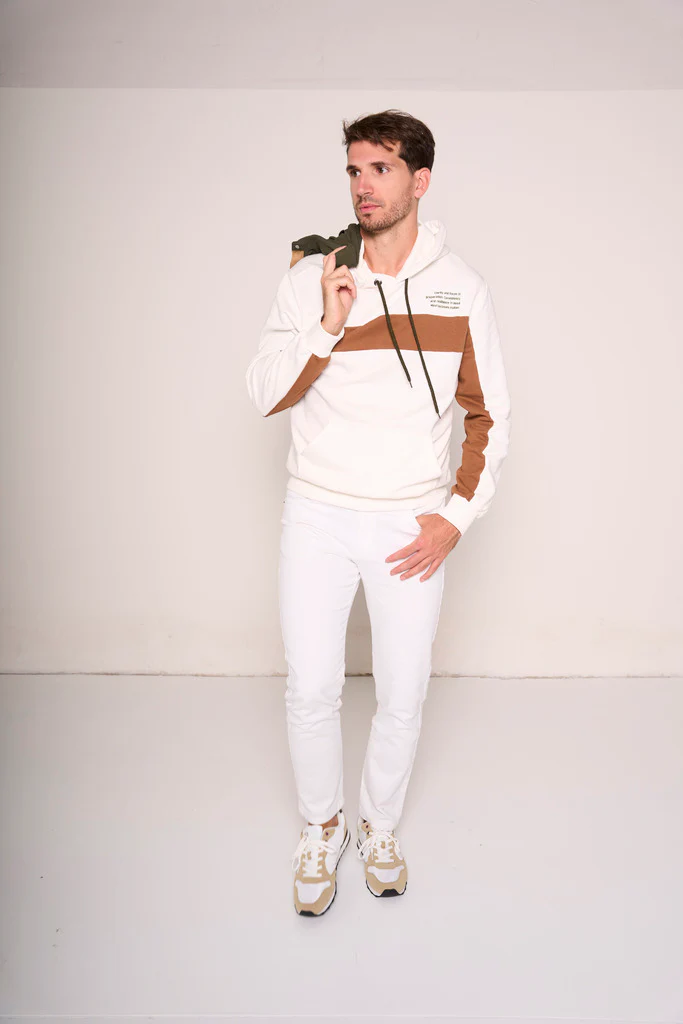 Un tocco grafico per rinnovare il classico streetwear: questa felpa chiusa in colore panna si distingue per la fascia centrale marrone a contrasto che attraversa il capo con carattere. Dotata di cappuccio con coulisse e tasca a marsupio, รจ lโalleata ideale per uno stile casual ma ricercato. I dettagli delle maniche con inserti marroni aggiungono coerenza visiva e modernitร . Da indossare con jeans, pantaloni sportivi o sotto un bomber leggero per un outfit urbano che non passa inosservato.