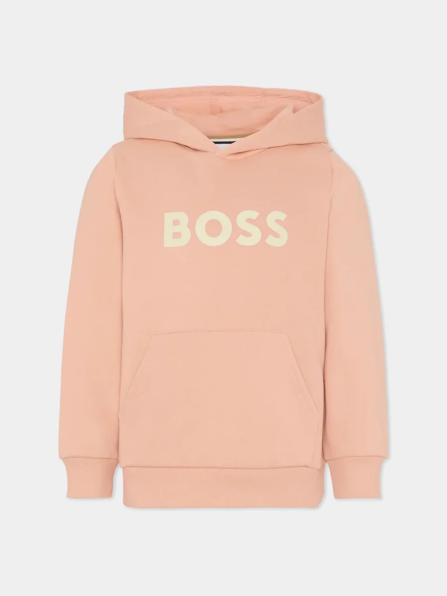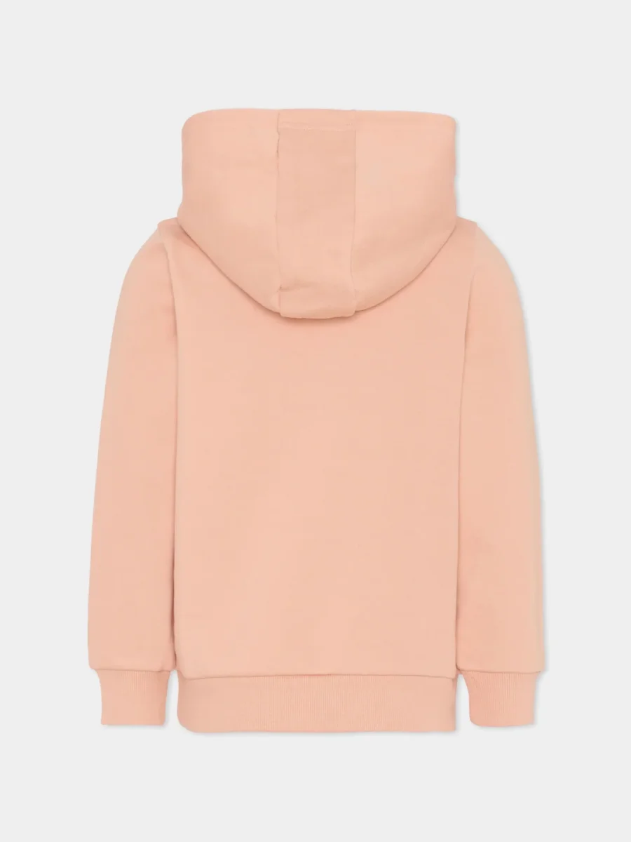 Felpa rosa in misto cotone felpato, a maniche lunghe, con cappuccio, tasca frontale, polsini e orlo a costine. ร decorata con stampa logo bianco sulla parte anteriore. Composizione: 87%cotone – 13%poliestere