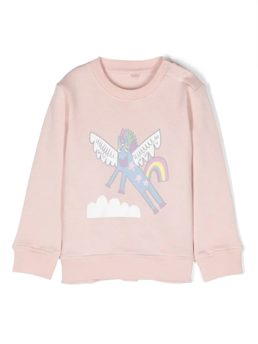 Felpa di Stella McCartney con stampa unicorno rosa polvere, cotone, girocollo, maniche lunghe, polsini elasticizzati, orlo elasticizzato e orlo dritto. Vestibilitร regolare e comoda.
