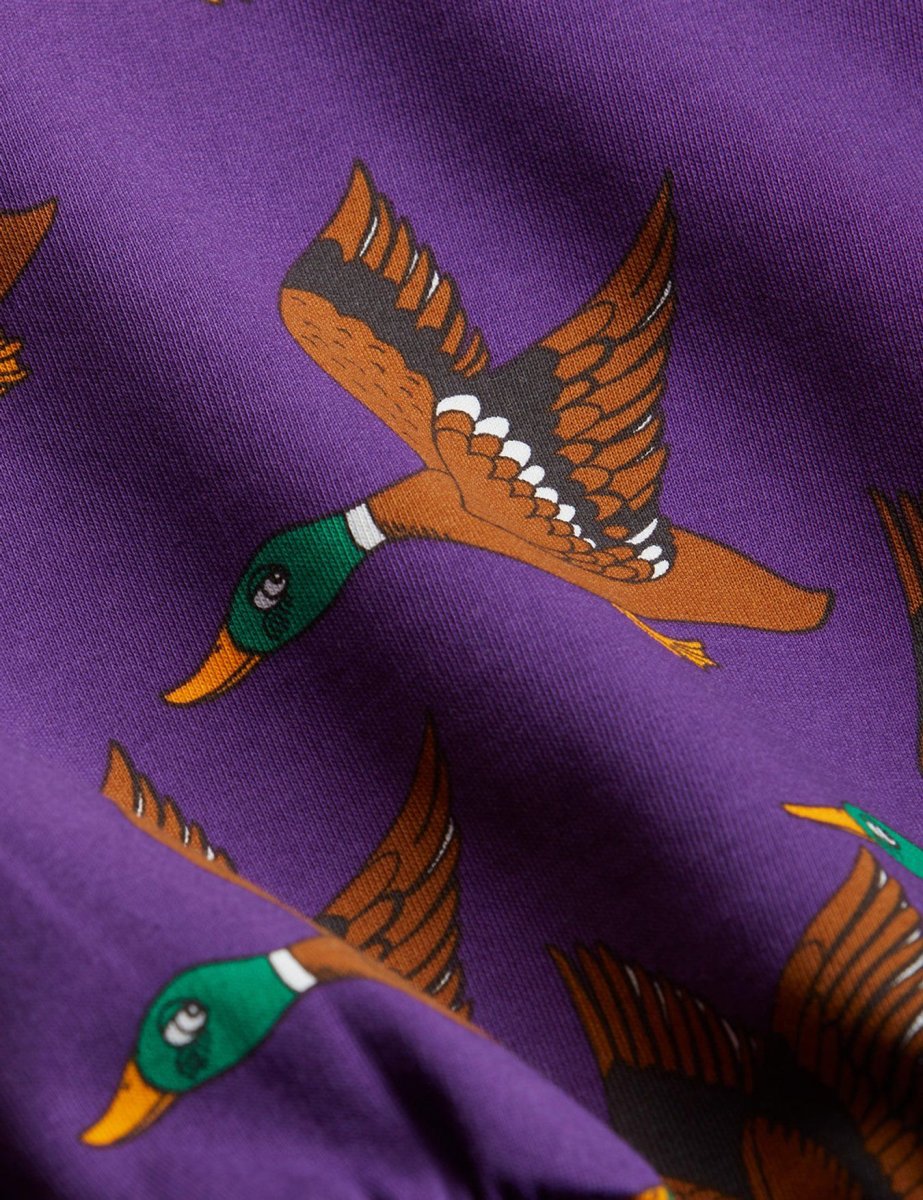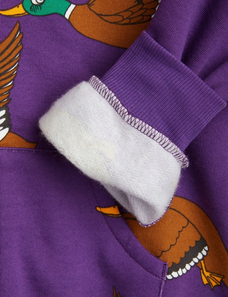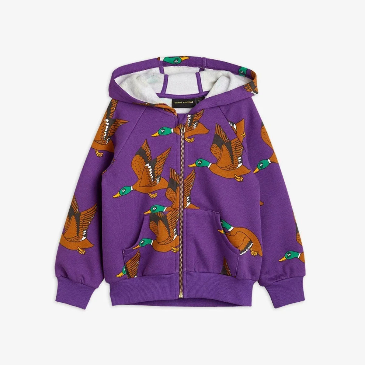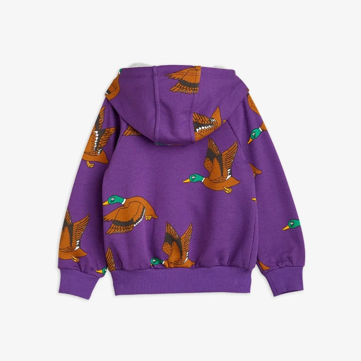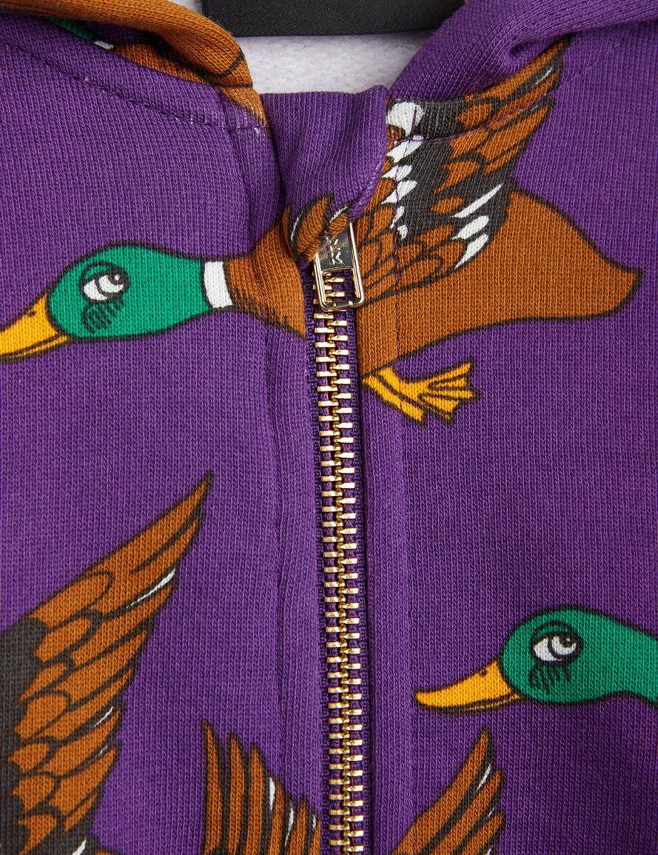 Felpa con cappuccio e zip con stampa Ducks all over realizzata in 100% cotone biologico certificato GOTS. La felpa con cappuccio รจ progettata con una cerniera in metallo dorato, due tasche nella parte anteriore e polsini e orlo inferiore a coste