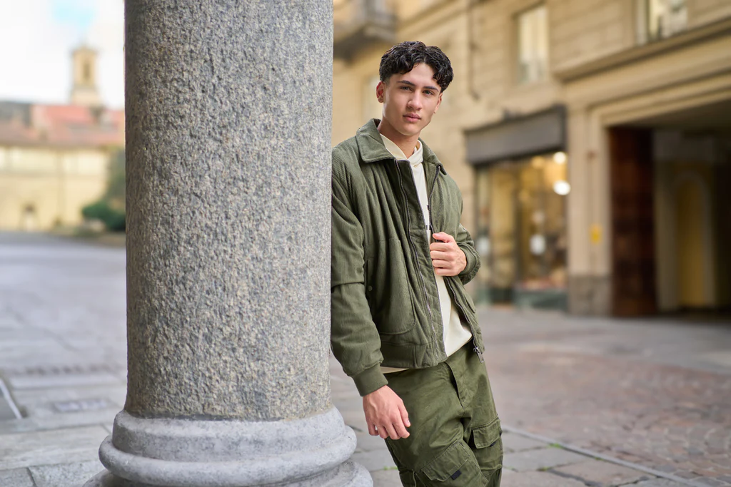 Giacca bomber a coste, con zip frontale, tasche applicate e dettaglio con zip sulla manica. Caratterizzato da colletto, polsini e fondo in maglia.