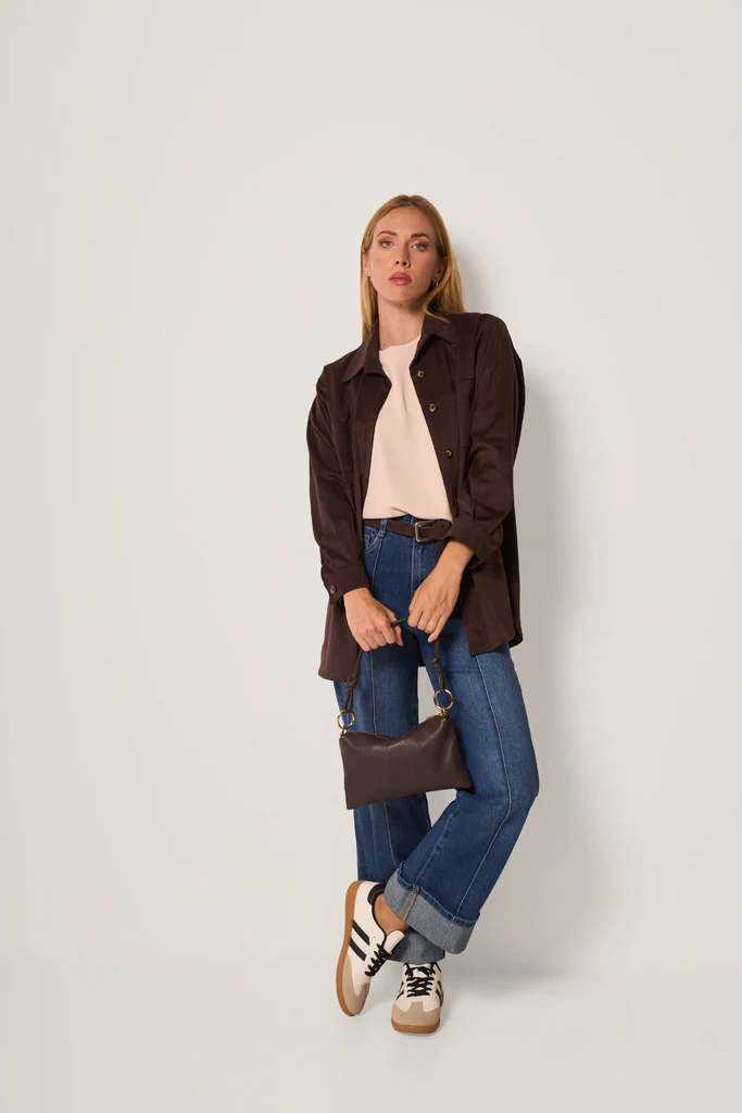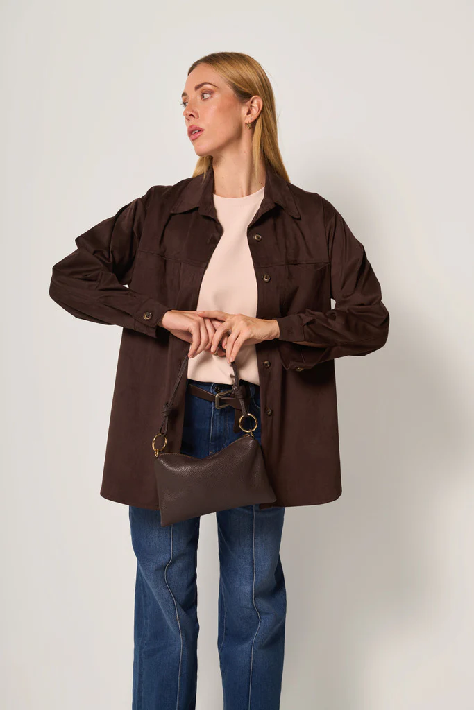 Giacca camicia REJANE dal taglio morbido in tessuto effetto scamosciato, perfetta per la mezza stagione.Il modello presenta colletto classico, chiusura frontale con bottoni tono su tono e taschini applicati sul petto.