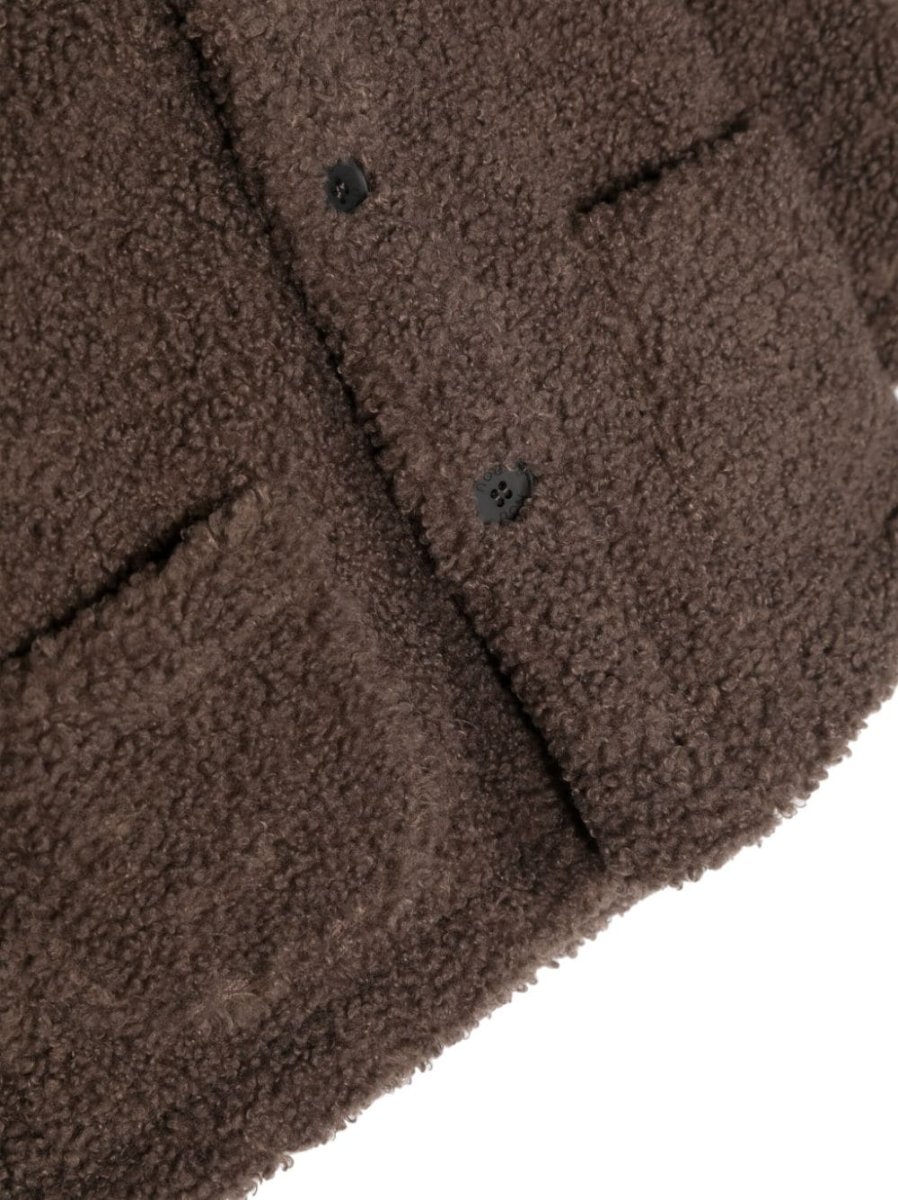 Giacca con cappuccio sabbia, design in finto shearling, cappuccio, chiusura frontale con bottoni, maniche lunghe, due tasche applicate frontali e orlo dritto.