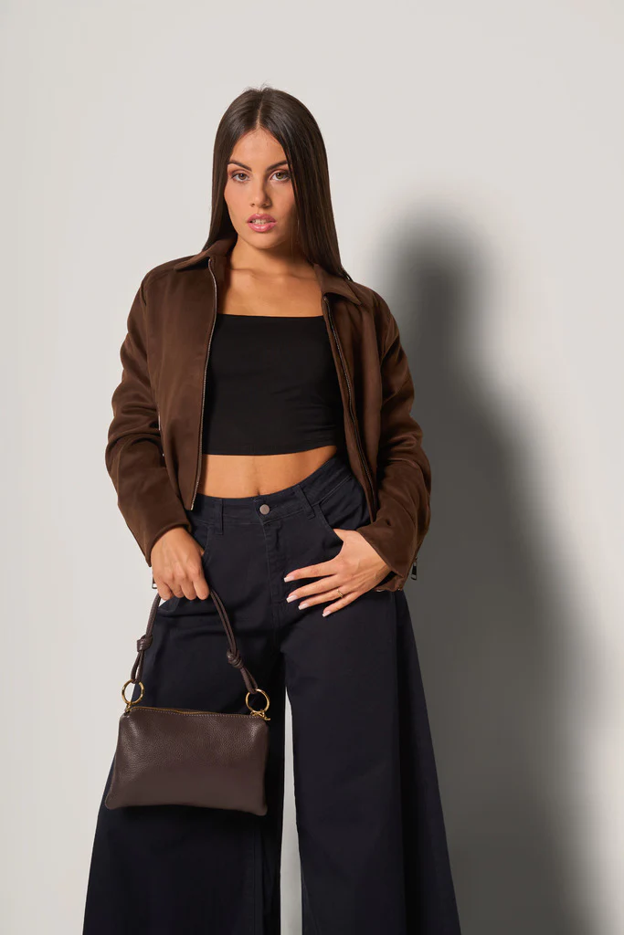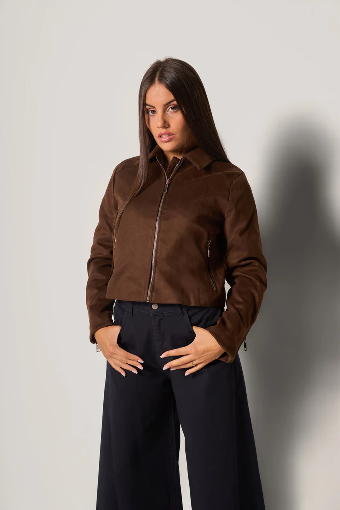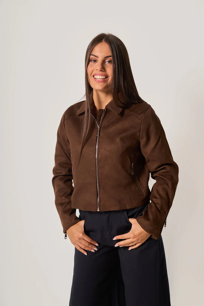 Giacca corta realizzata in morbido tessuto effetto scamosciato, dal finish vellutato e sofisticato. Il modello presenta colletto classico, chiusura con zip metallica, e tasche laterali con zip. La linea leggermente svasata sul fondo valorizza la figura senza rinunciare al comfort.