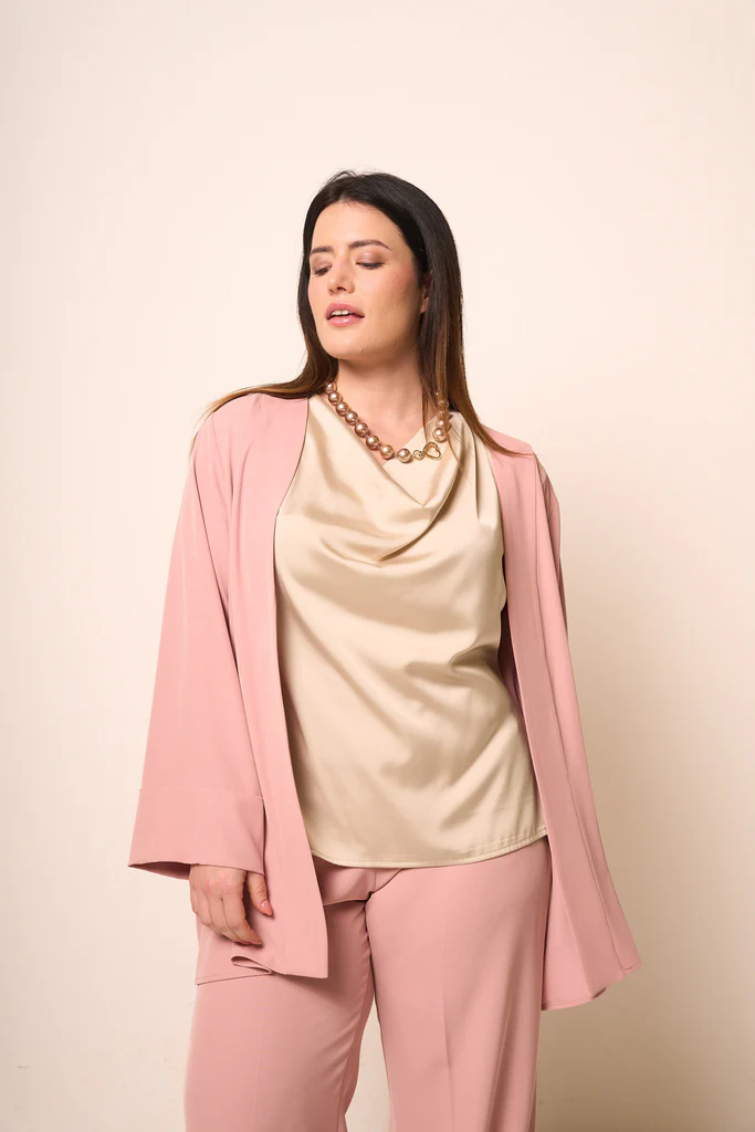 Descrizione:Giacca donna in elegante tonalitร rosa cipria, caratterizzata da una linea fluida e contemporanea. Realizzata in tessuto leggero e morbido, avvolge la silhouette con naturalezza garantendo comfort e movimento.Il design presenta una vestibilitร morbida con maniche ampie e taglio essenziale, privo di chiusure, per un effetto raffinato e moderno. La lunghezza leggermente oltre i fianchi la rende perfetta sia su top eleganti che su look piรน casual.Ideale in coordinato con pantaloni della stessa tonalitร o abbinata a capi neutri, รจ il capo perfetto per creare outfit sofisticati e femminili, adatti a occasioni formali o a contesti smart-casual di classe.