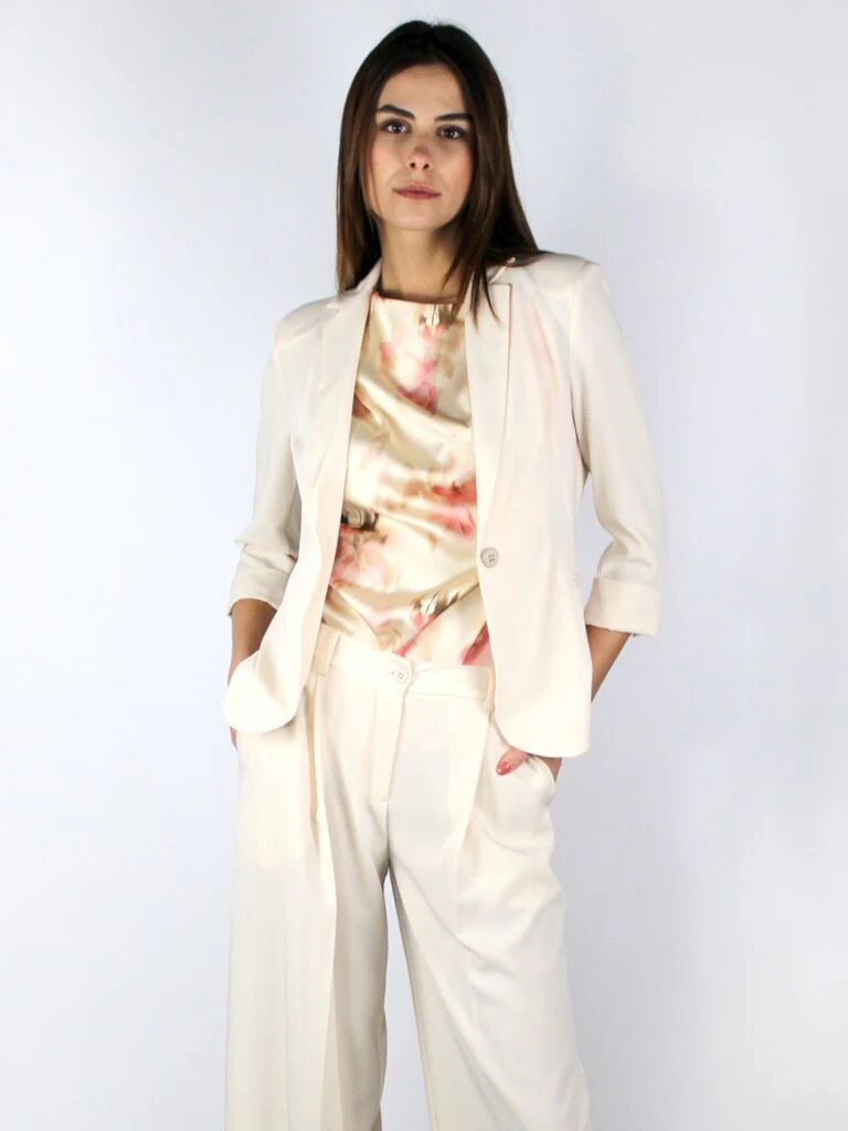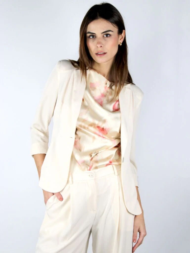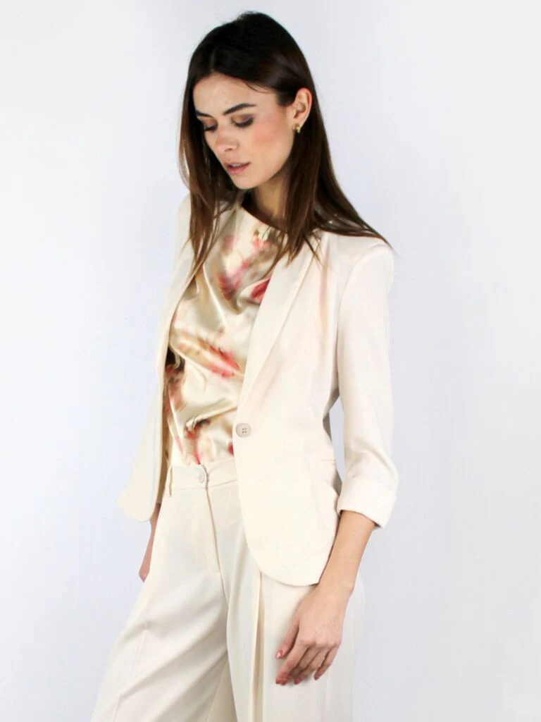 DESCRIZIONE:giacca in tessuto fluido,chiusura con un bottone e tasche a filettoComposizione: 93% poliestere, 7% elastanCodice prodotto: 257088