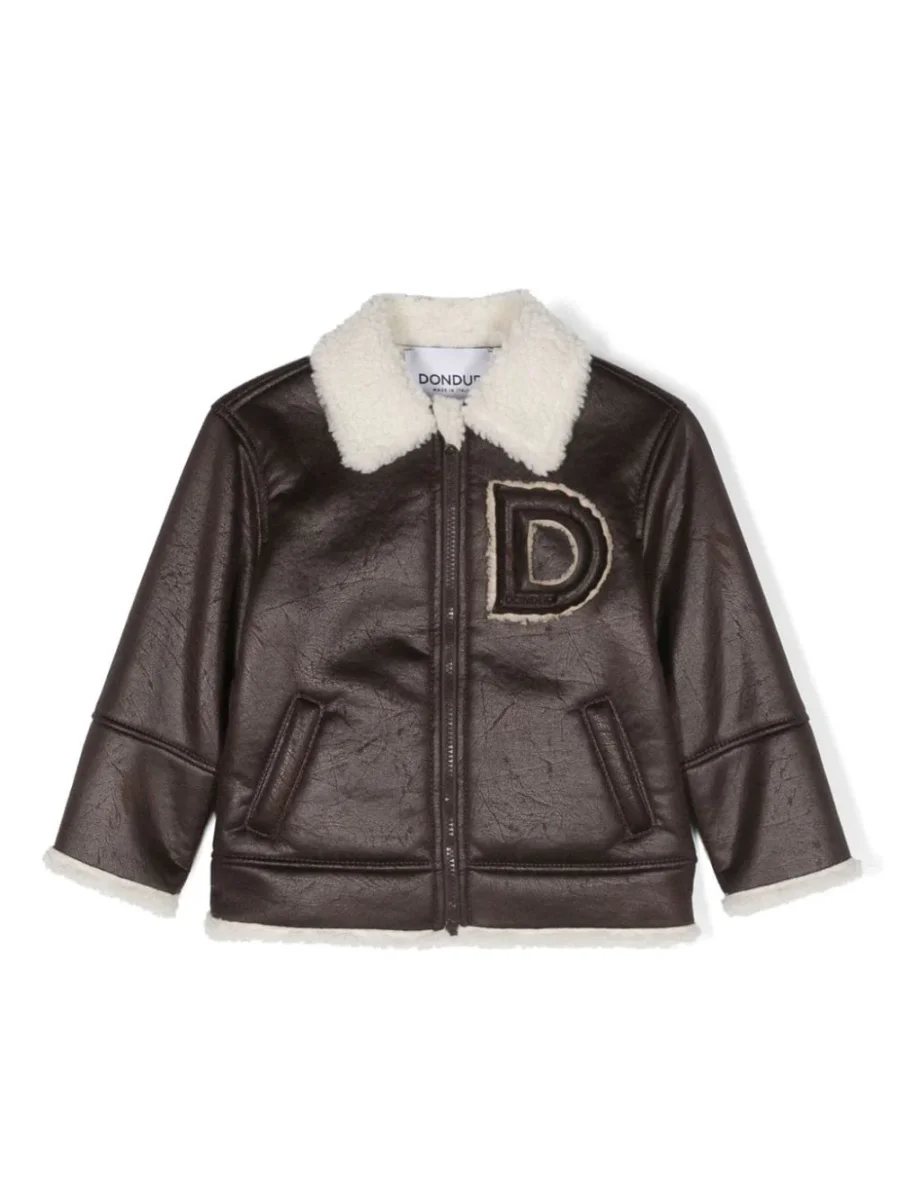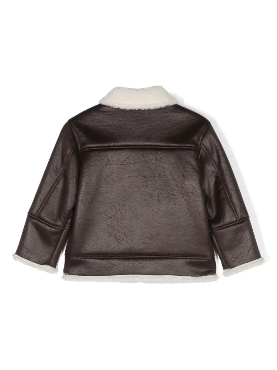 Bomber con logo goffrato caffรจ, pelle cruelty-free, logo goffrato nella parte anteriore, rifinitura in finto shearling, colletto classico, chiusura frontale con zip a doppio cursore, maniche lunghe e due tasche a filetto laterali.