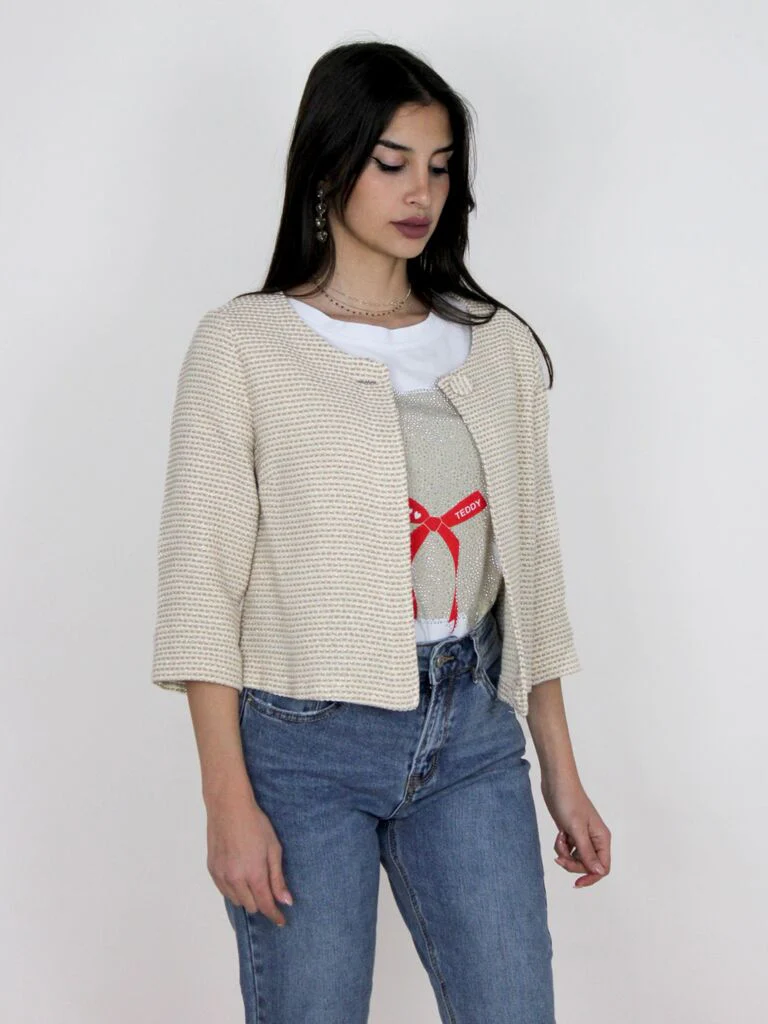 DESCRIZIONE:Giacchino con un bottone in tinta, filo lurexComposizione: 59% cotone, 38% poliestere, 3% altre fibreCodice prodotto: 251026