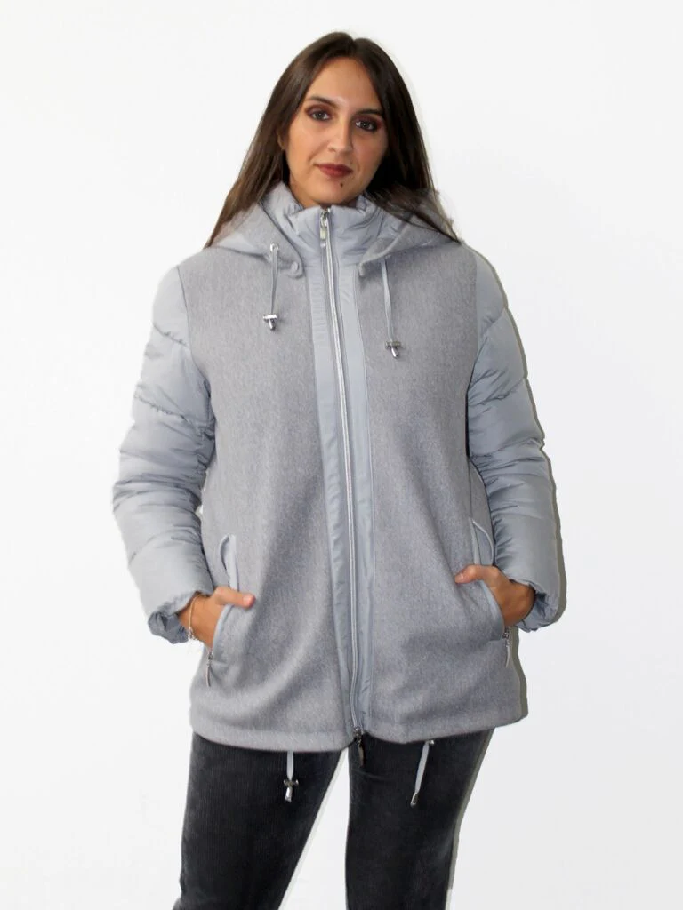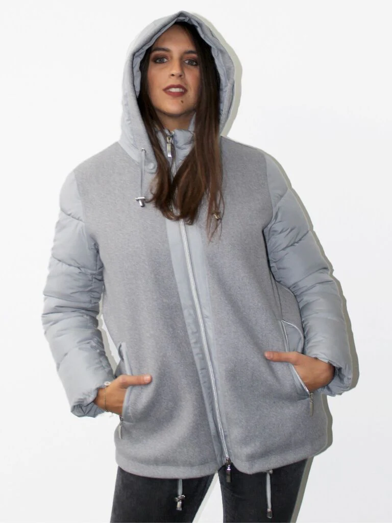 Giaccone in tessuto con inserti trapuntati, cappuccio con coulisse staccabile, chiusura e tasche zip