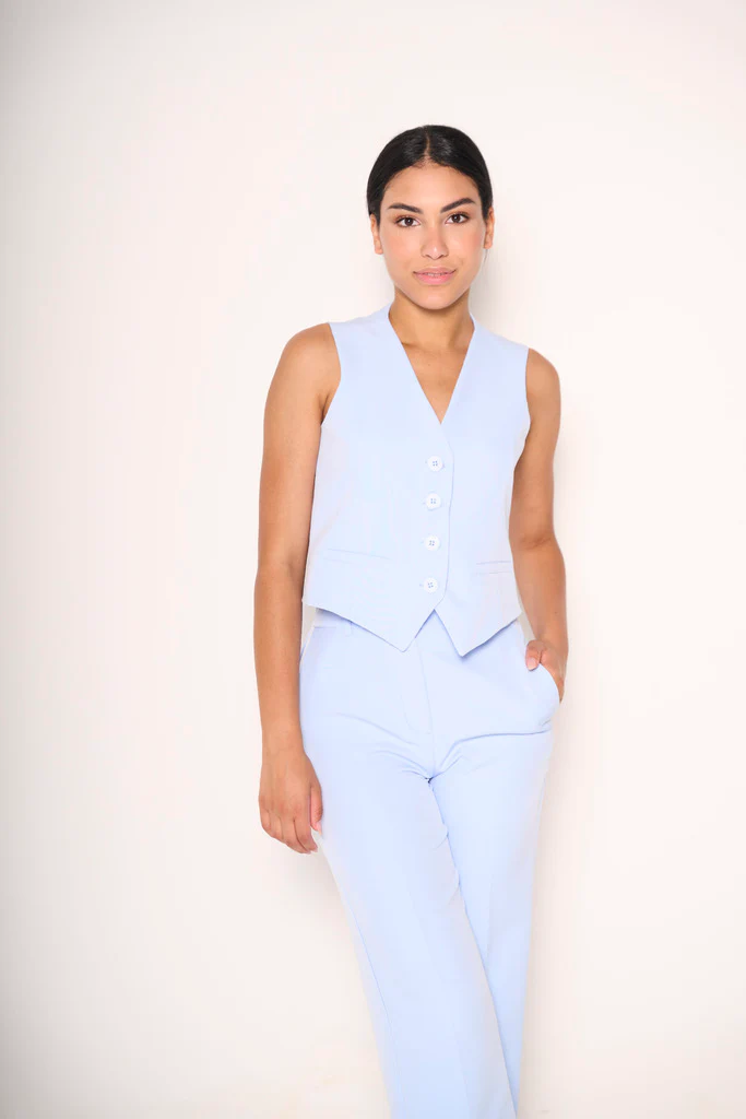 Questo gilet azzurro dal taglio dritto รจ un capo chiave per costruire look raffinati ma versatili. Con scollo a V, chiusura frontale a bottoni e tessuto leggermente strutturato, รจ perfetto sia da solo per un tocco minimal-chic che sopra camicie o top per outfit piรน stratificati. La tonalitร neutra lo rende facile da abbinare, donando equilibrio e raffinatezza a qualsiasi combinazione.