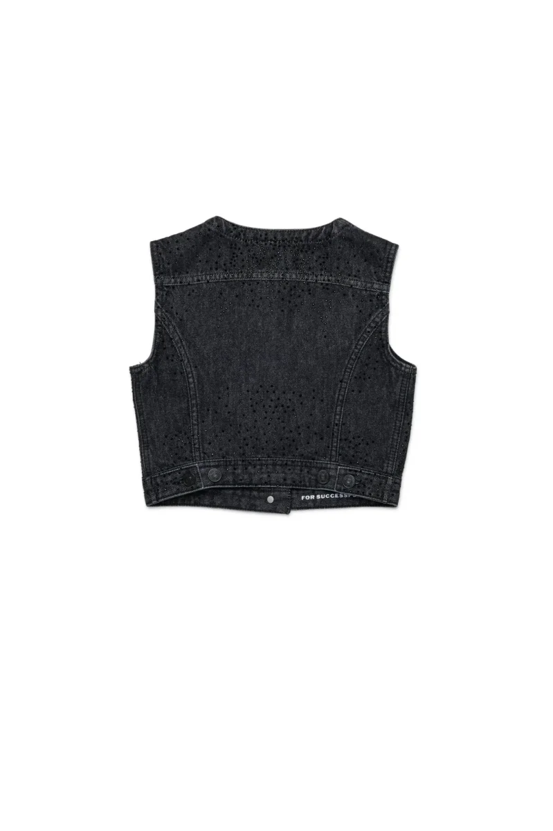 Gilet in denim nero arricchito da applicazioni hotfix che creano giochi di luce e movimento, rendendo questo capo perfetto per aggiungere un tocco raffinato e originale a qualsiasi outfit.