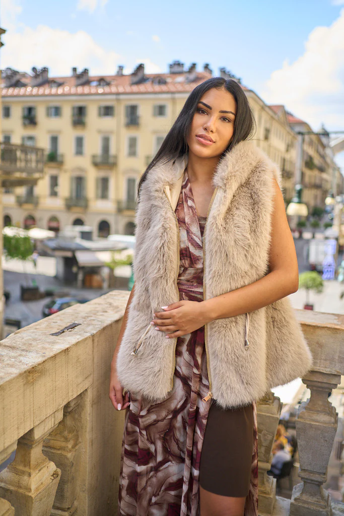 Gilet smanicato in morbida ecopelliccia, dal design elegante e avvolgente. Dotato di cappuccio, chiusura frontale con zip e coulisse regolabili, รจ il capo perfetto per aggiungere calore e stile ai tuoi outfit casual chic o per completare look piรน ricercati.