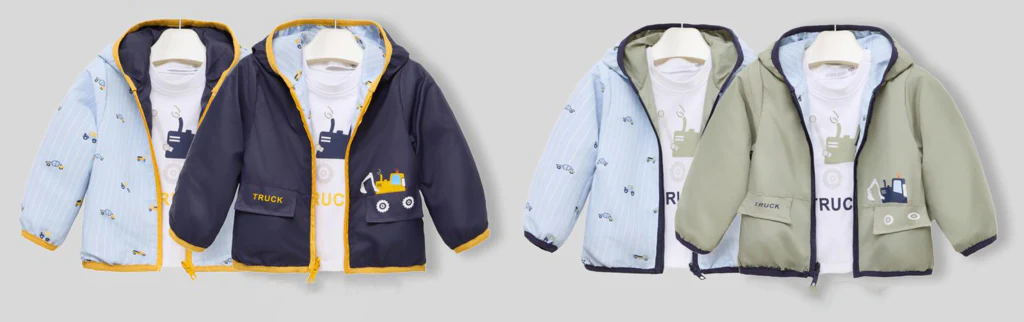 Giubbottino baby reversibile con fantasia interna ed esterna. Con cappuccio, zip e elastico ai polsi.