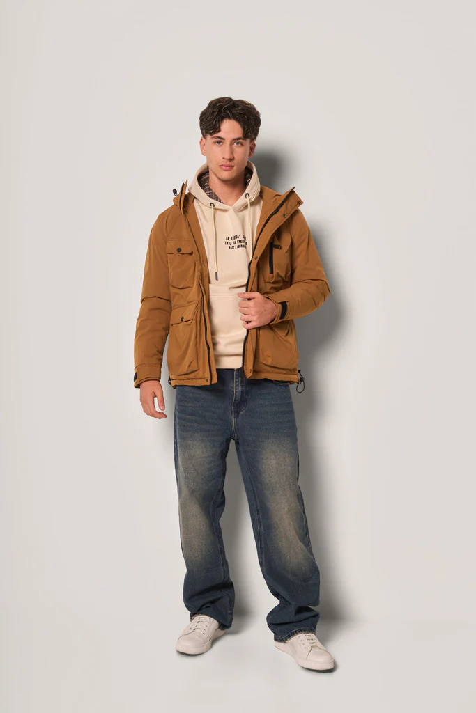 Giubbotto da uomo realizzato in tessuto tecnico antivento, ideale per la stagione fredda. Presenta una linea moderna con cappuccio regolabile, tasche frontali con patta e zip e chiusura con zip e bottoni a pressione.