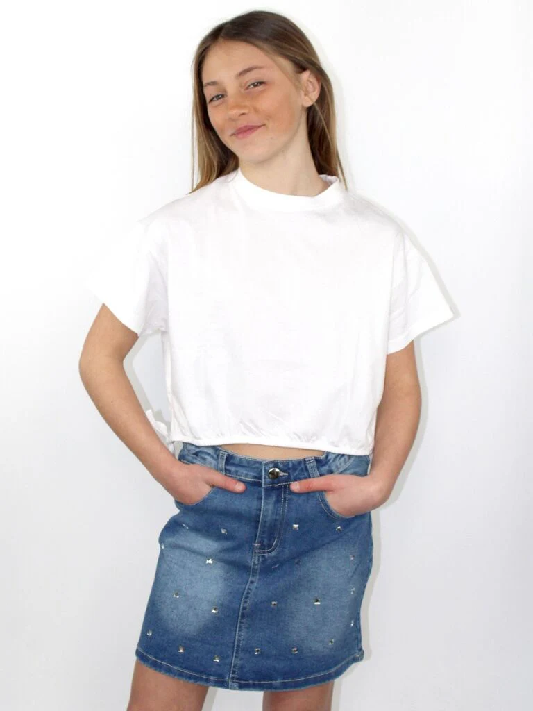 DESCRIZIONE: Gonna dritta in jeans con applicazione davanti di strass piccoli quadrati, con tasche oblique e chiusura bottone e zipComposizione: 70% cotone, 28% poliestere, 2% elastanCodice prodotto: 257209