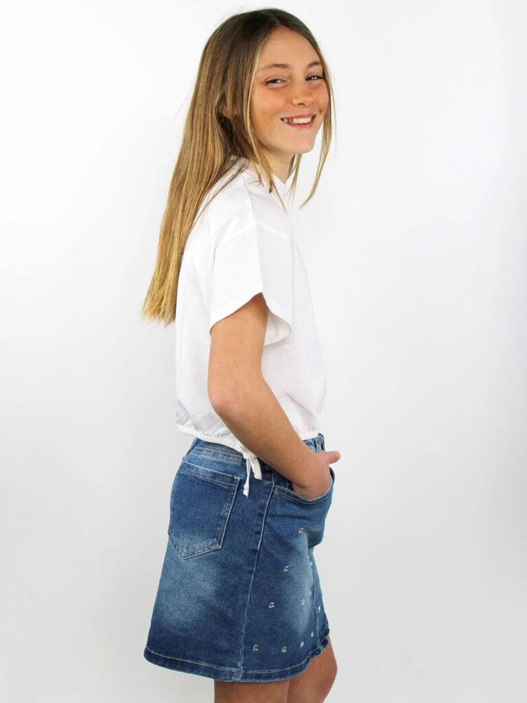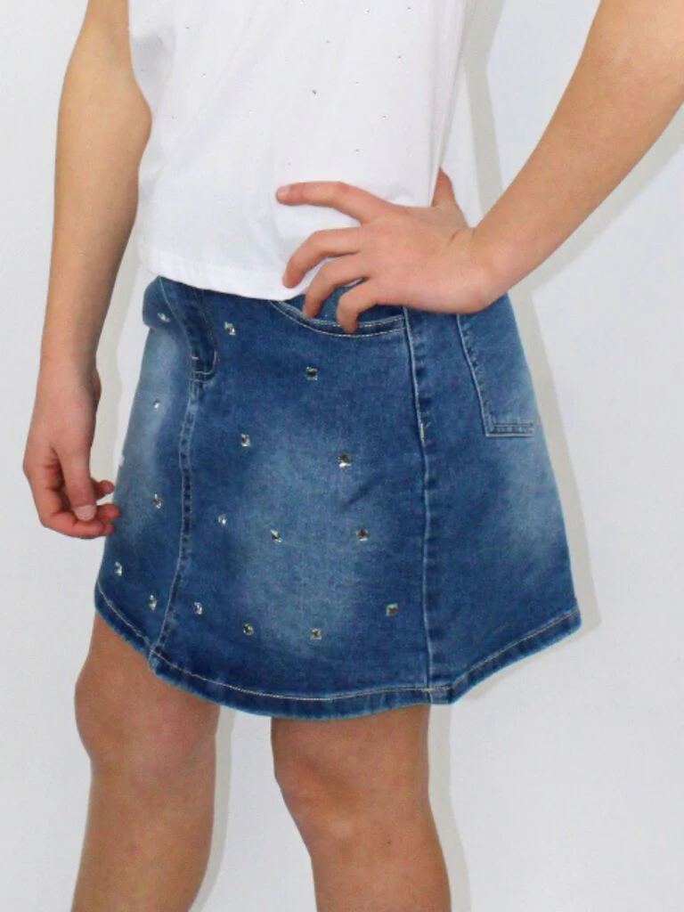 Gonna dritta in jeans con applicazione davanti di strass piccoli quadrati, con tasche oblique e chiusura bottone e zip
