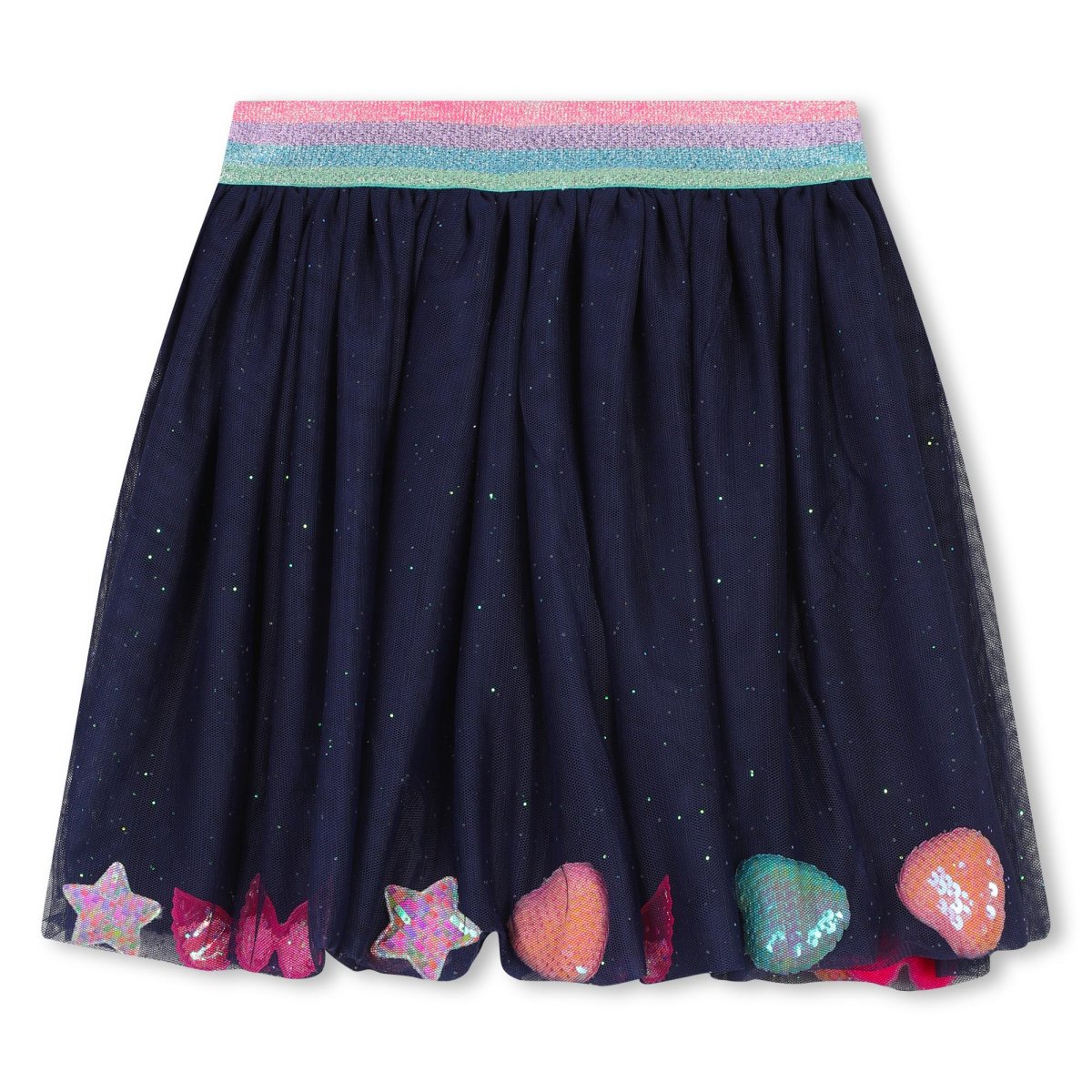 L’elegante gonna Billieblush รจ perfetta per i giorni di festa. Presenta morbido taglio skater, con leggero effetto plissettato. ร foderata e realizzata in tulle glitter, decorato da elementi di paillettes di diverse forme. L’elastico a righe multicolori compone la vita. Composizione 100 % Poliestere, Fodera 100 % Viscosa, Rifinitura 100 % Poliestere