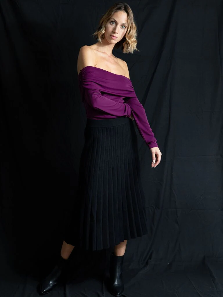 DESCRIZIONE: Gonna in maglia plissettata tutta elastica Composizione: 40% viscosa, 22% modal, 28% acrilico, 10% elastan Codice prodotto: 255211