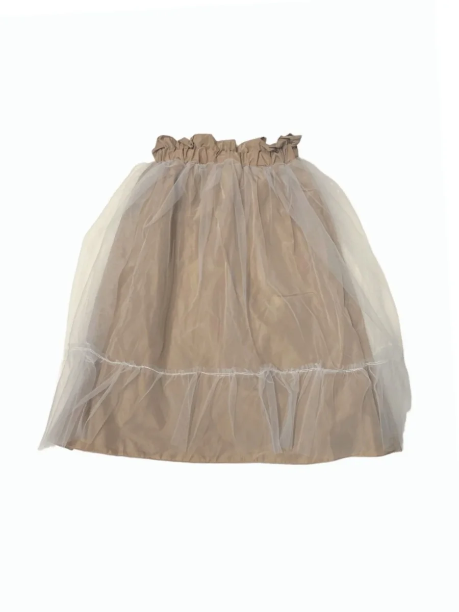 La gonna beige tessuto in lucido presenta intorno alla vita il tulle bianco. Vestibilitร  morbida e regolare. Ottima per qualsiasi occasione.