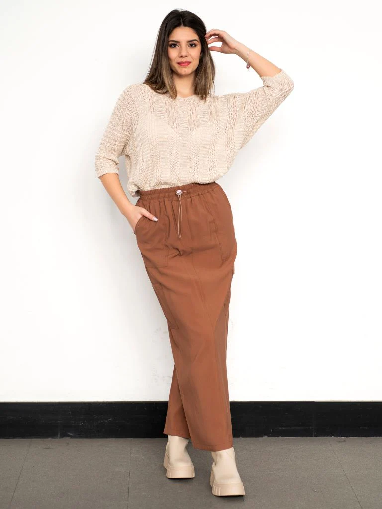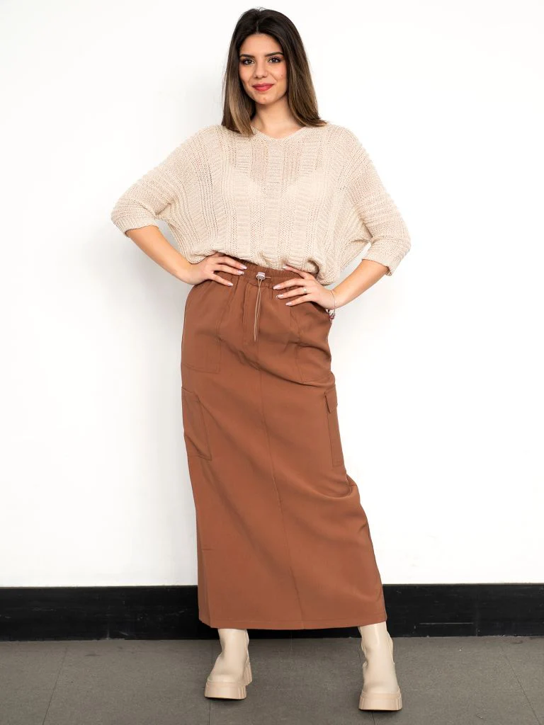 Gonnellone maxi in tessuto di viscosa con elastico a coulisse in vita. Modello cargo con tasconi applicati lateralmente e spacco posteriore