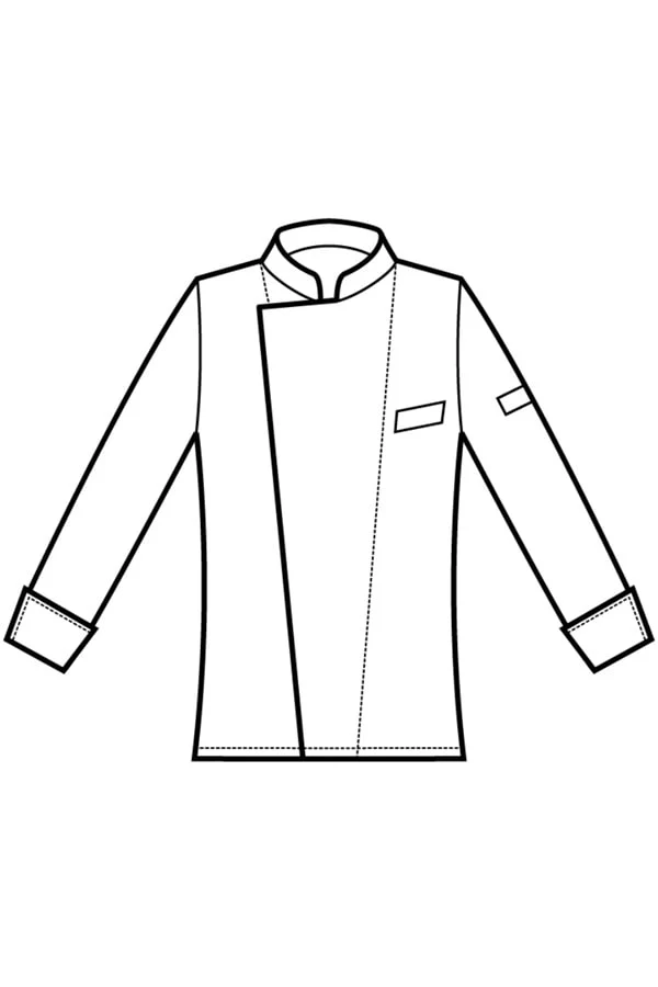 Giacca dal taglio moderno con collo simmetrico coreano e chiusura leggermente laterale con bottoni nascosti a pressione. microforata sui fianchi nella schiena. Una giacca attuale con tasca sul petto e taschino sulla spalla sinistra.