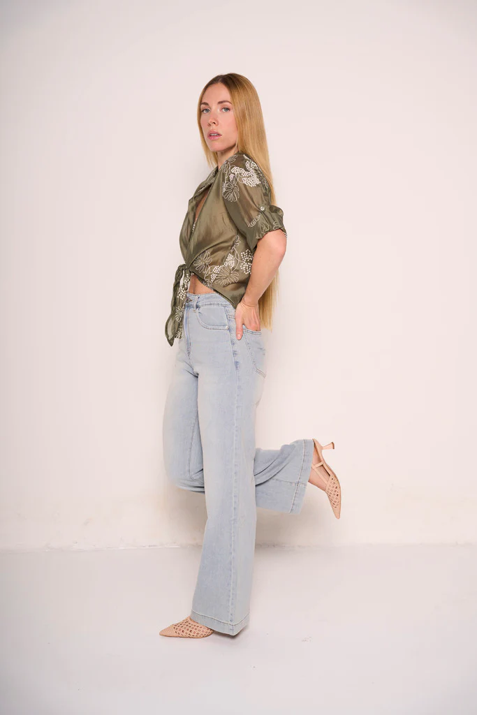 Questi jeans a gamba larga in denim chiaro sono la sintesi perfetta tra comfort e stile contemporaneo. Il design a vita alta valorizza la silhouette, mentre la linea morbida e fluida aggiunge un tocco effortless e super chic. Versatili e facili da abbinare, sono il capo ideale da indossare con t-shirt, crop top o camicie oversize per look casual che non passano inosservati. Impossibile resistere al loro fascino urbano con twist retrรฒ.