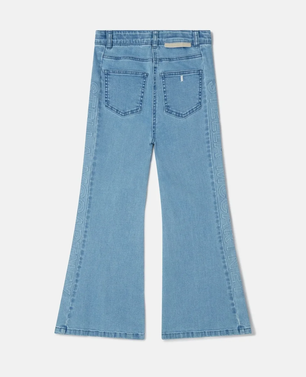 Jeans di Stella McCartney blu chiaro, taglio straight, logo laterale inciso, applicazione posteriore con logo, vita media, passanti, chiusura frontale con bottoni e zip e design classico a cinque tasche.