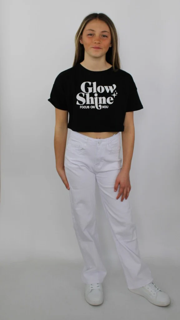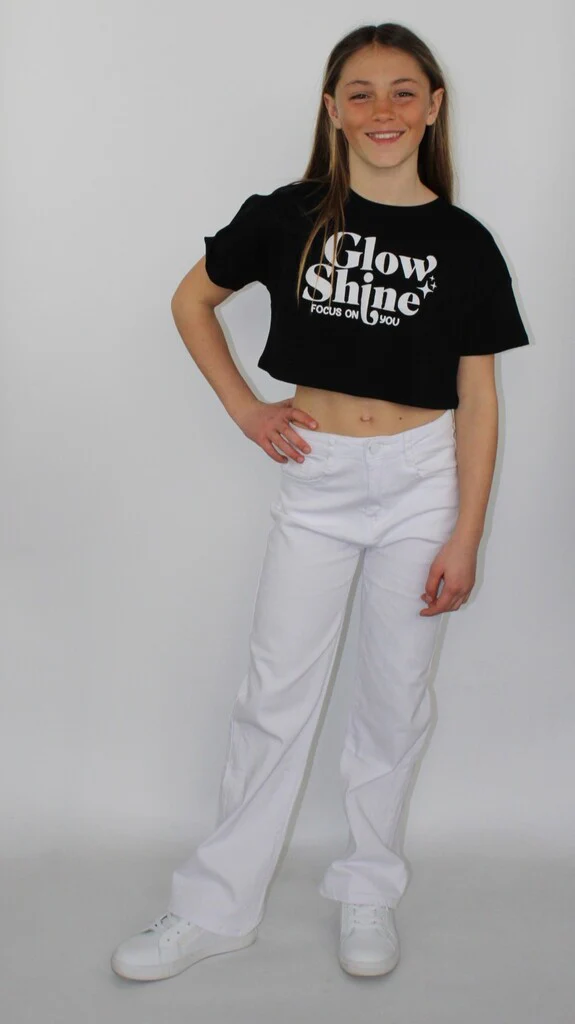 Pantaloni bianchi da ragazza, modello a gamba larga. Comodi e versatili, ideali per un look fresco e moderno, perfetti da abbinare a crop top o t-shirt colorate.