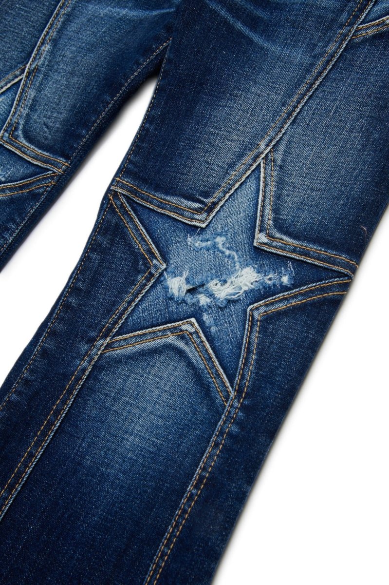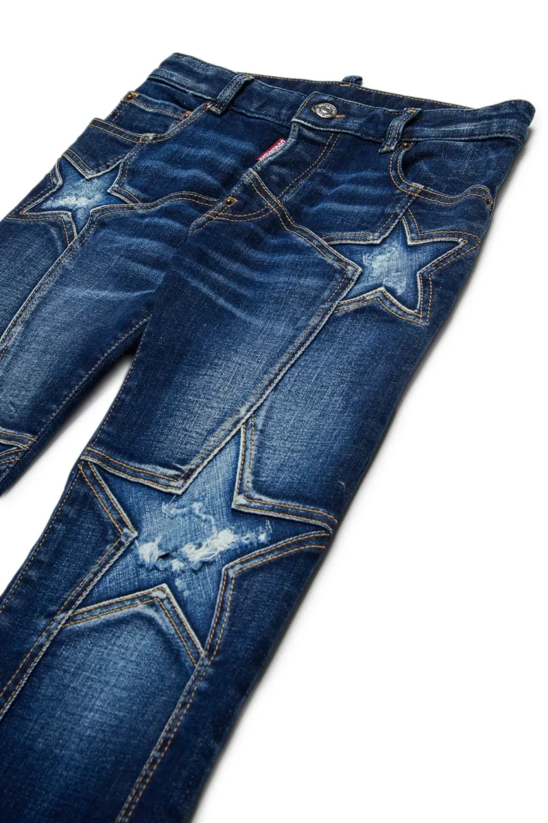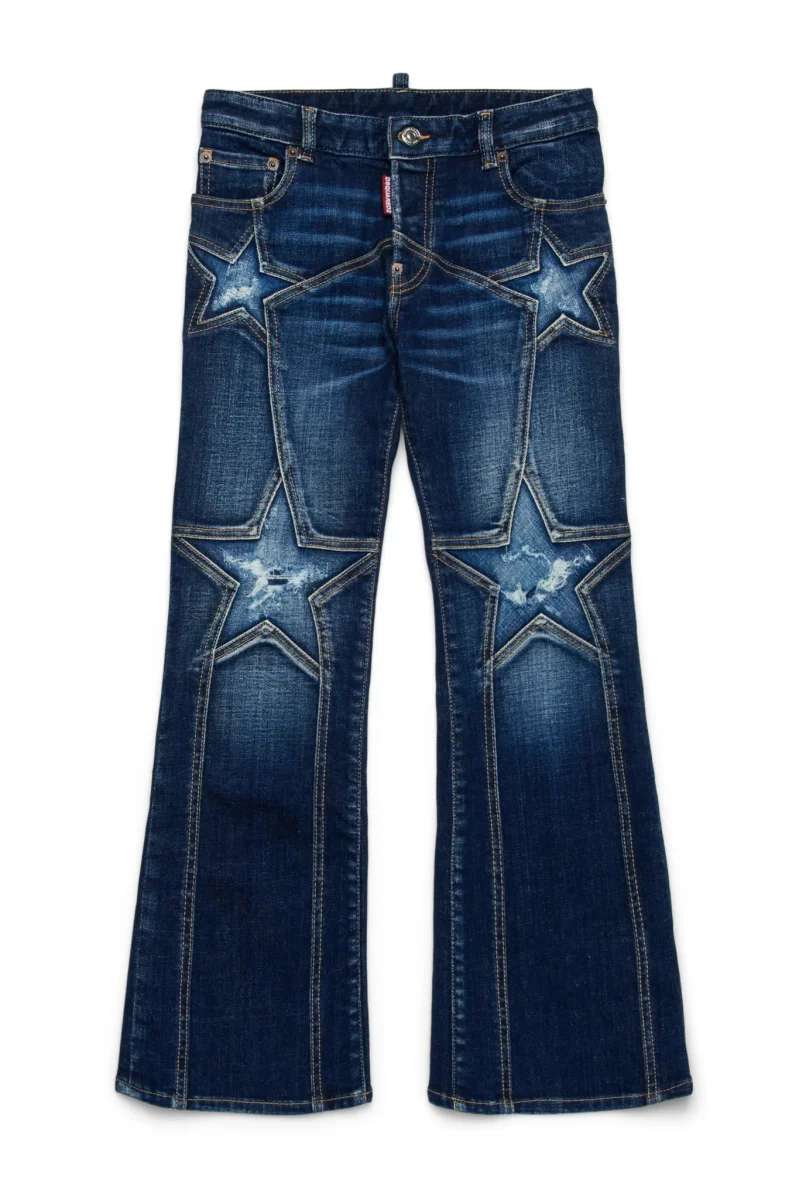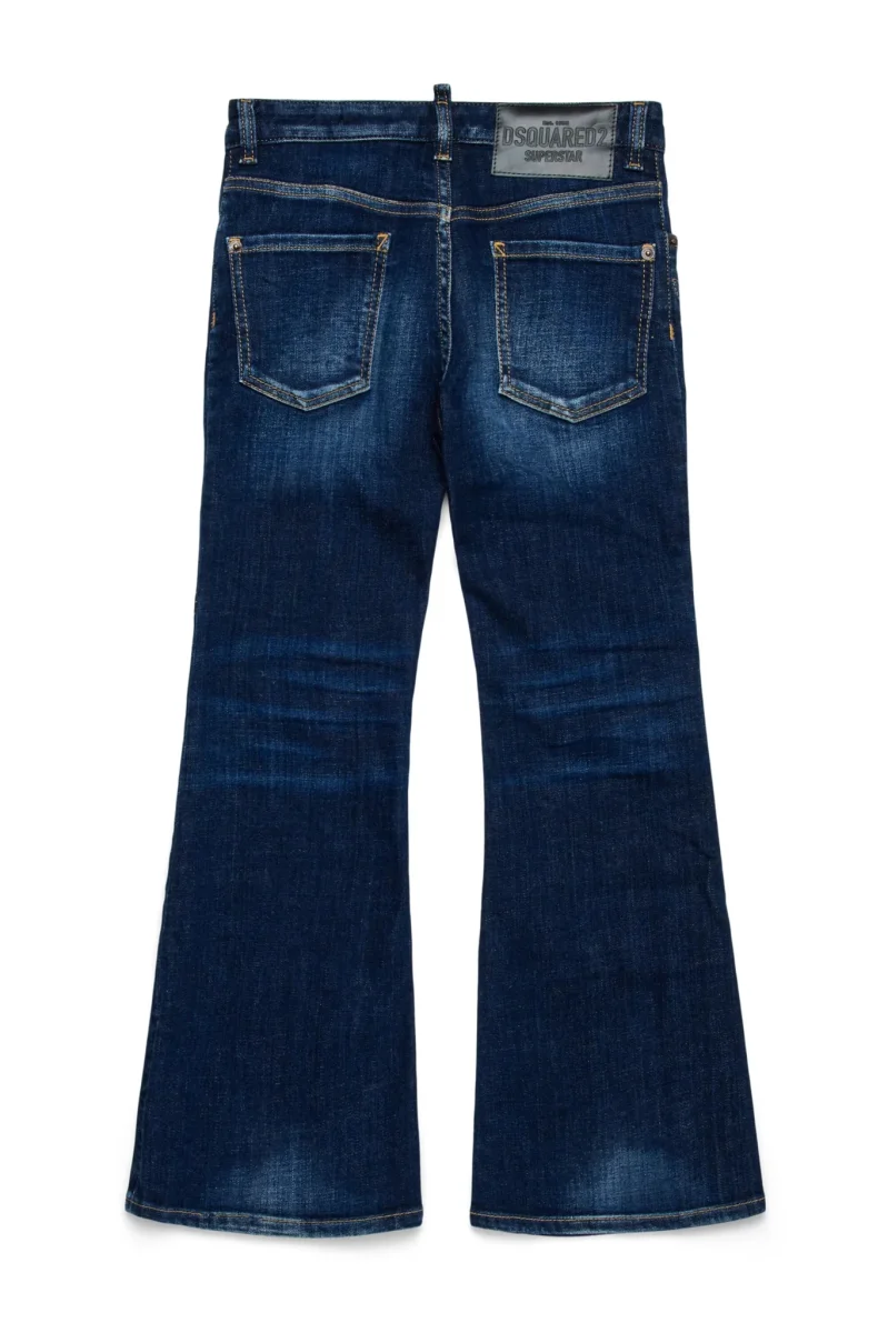 Jeans a cinque tasche dal fit bootcut. Realizzato in denim blu scuro, contraddistinto da sfumature, baffature e cuciture a contrasto cromatico. Super Star con rotture sfilacciate sul davanti. Label Dsquared2 applicata sulla patta (logo a bandierina).