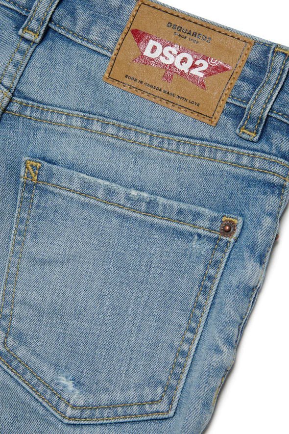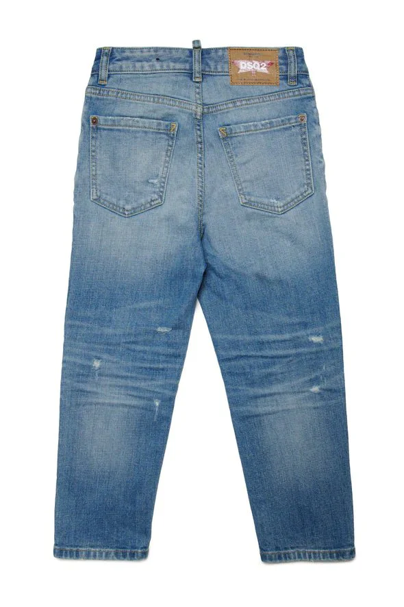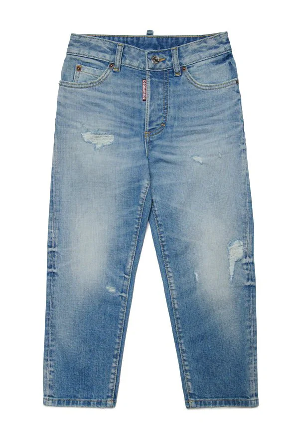 Jeans a cinque tasche dal fit boyfriend. Realizzato in denim blu chiaro contraddistinto da sfumature a contrasto cromatico, abrasioni e rotture sfilacciate. Label Dsquared2 applicata sulla patta (logo a bandierina).