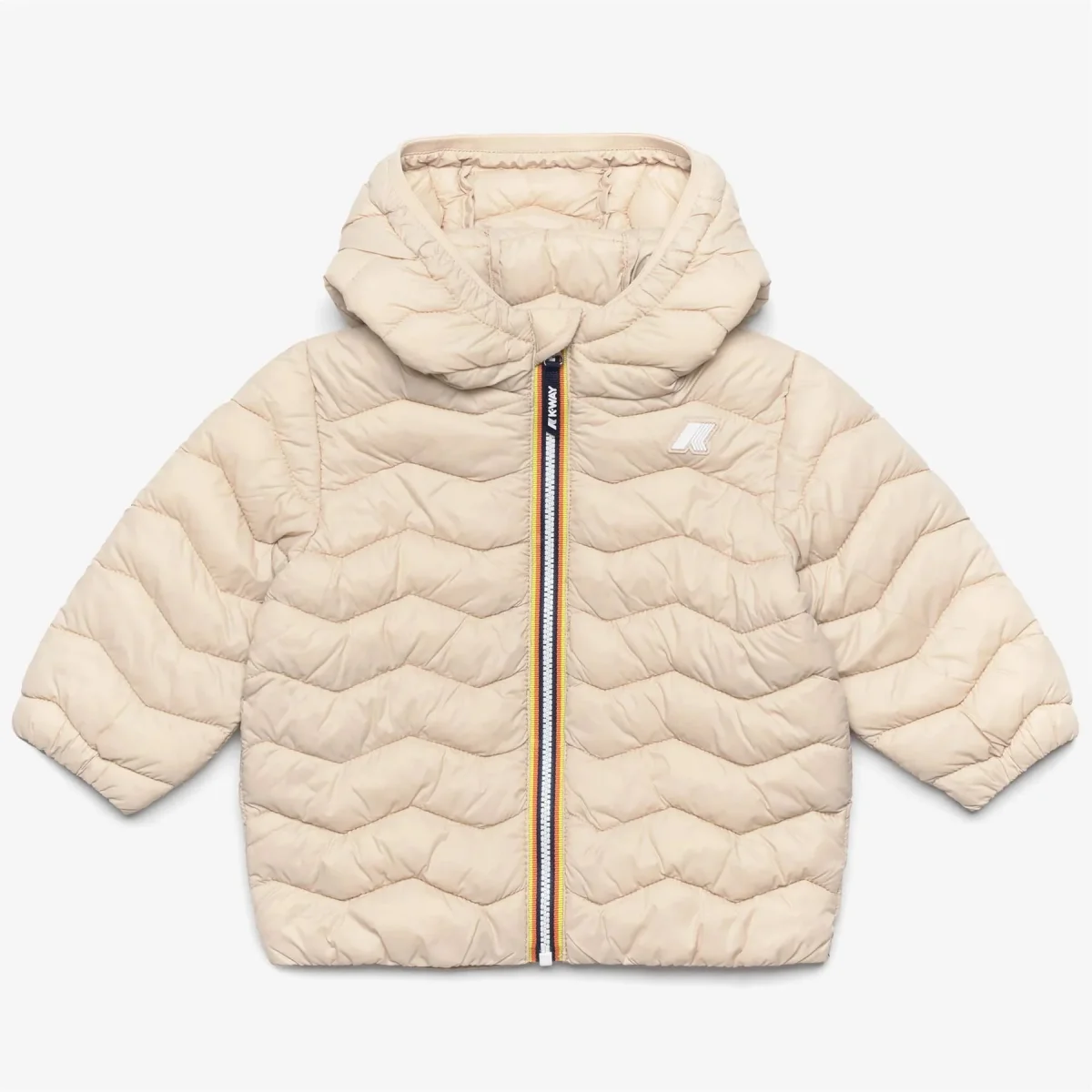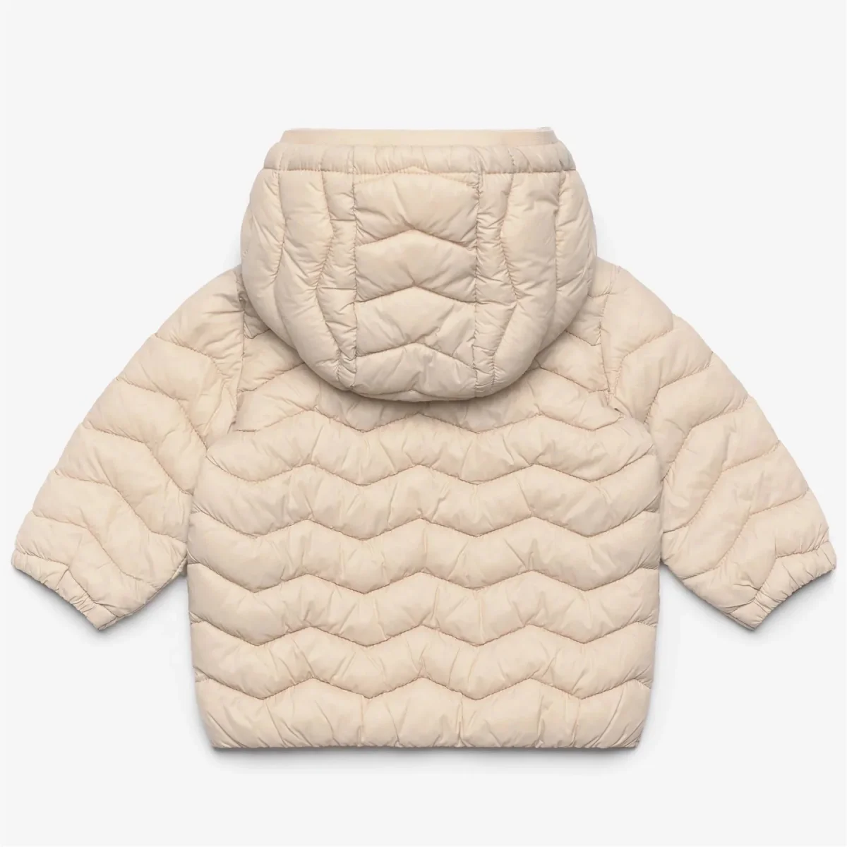Tessuto in nylon riciclato idrorepellente e antivento Isolamento Thermoreยฎ ecologico Modello trapunta onda Livello di calore medio Chiusura con cerniera Due tasche con bottoni automatici Cappuccio con elastico fisso Vestibilitร regolare Logo in silicone bianco