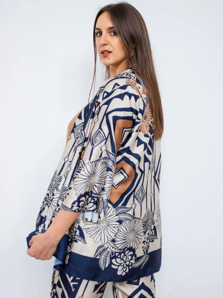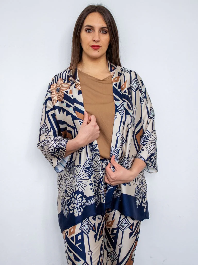 Kimono in rasetto in fantasia da completo. Tessuto fluido