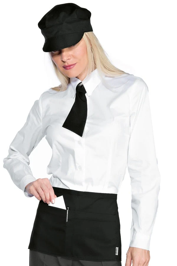 Grembile corto con grande tasca centrale a 2 scomparti. Molto pratico per blocchetti comande, ordini, penne, tablet e cassa. Realizzato in misto cotone. Disponibile in nero