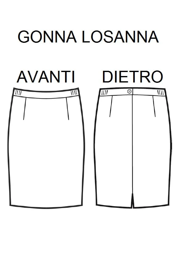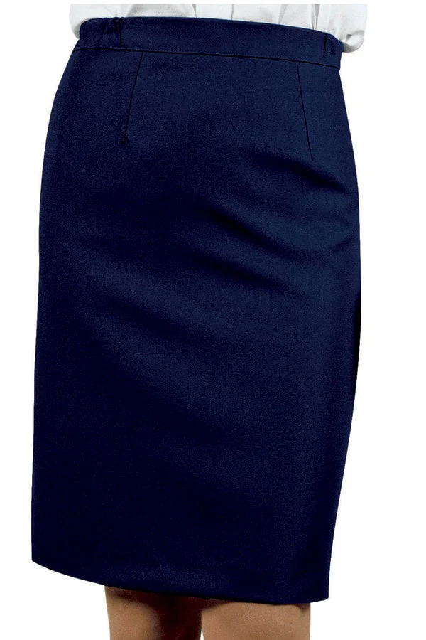 Gonna elegante per divise da reception e rappresentanza. Dal disegno classico con 2 pinces cucite anteriori e posteriori. Bottone con zip di apertura posteriore ed elasticizzazione in cintura sui fianchi. Comodissima da indossare. Realizzata in diversi tessuti e 3 colori. Dotata di piccolo spacchetto posteriore.