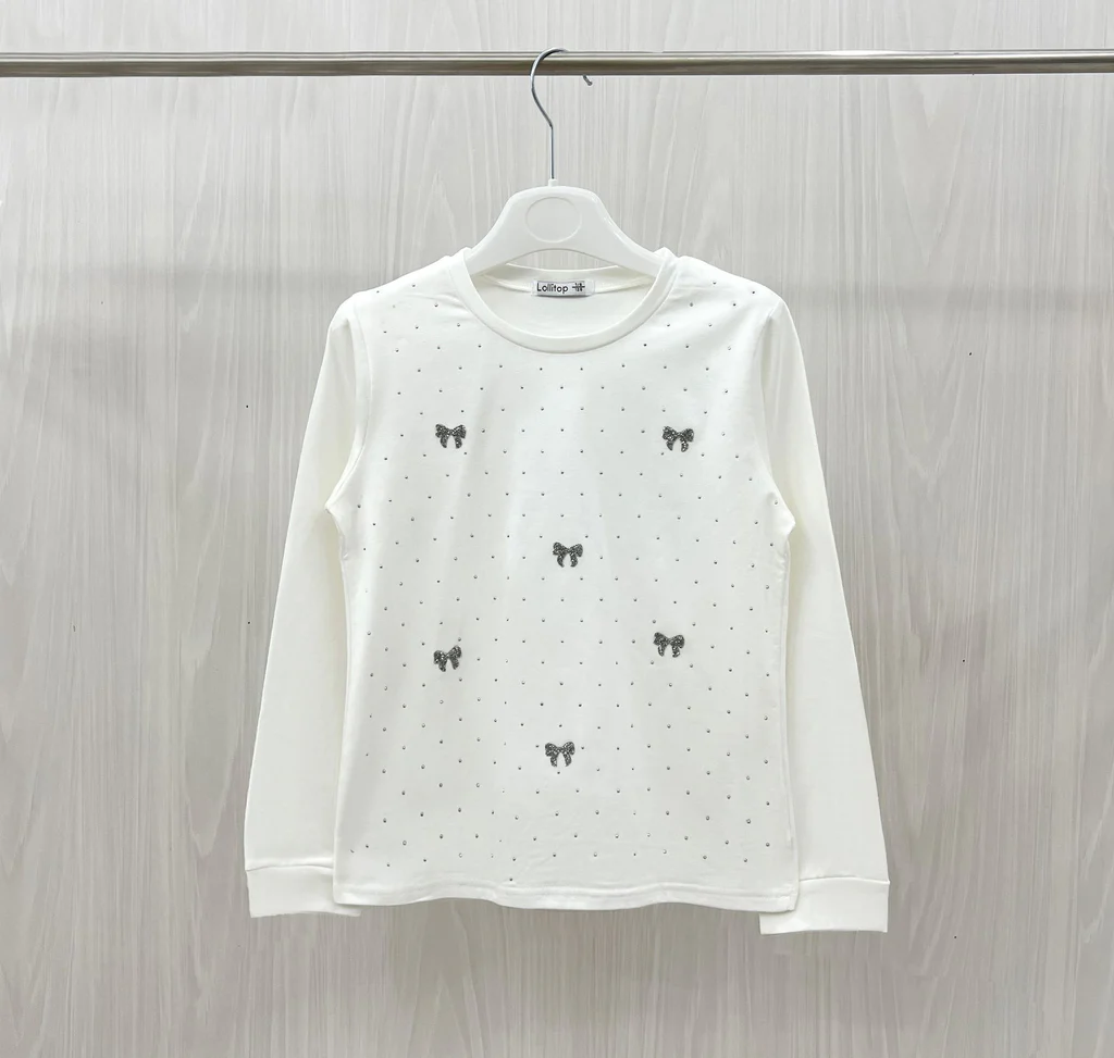 Maglia girocollo, dal design semplice e delicato. Il modello รจ decorato con piccoli strass e fiocchetti glitterati sul davanti, per un tocco romantico e luminoso. Perfetta per look quotidiani o occasioni speciali.
