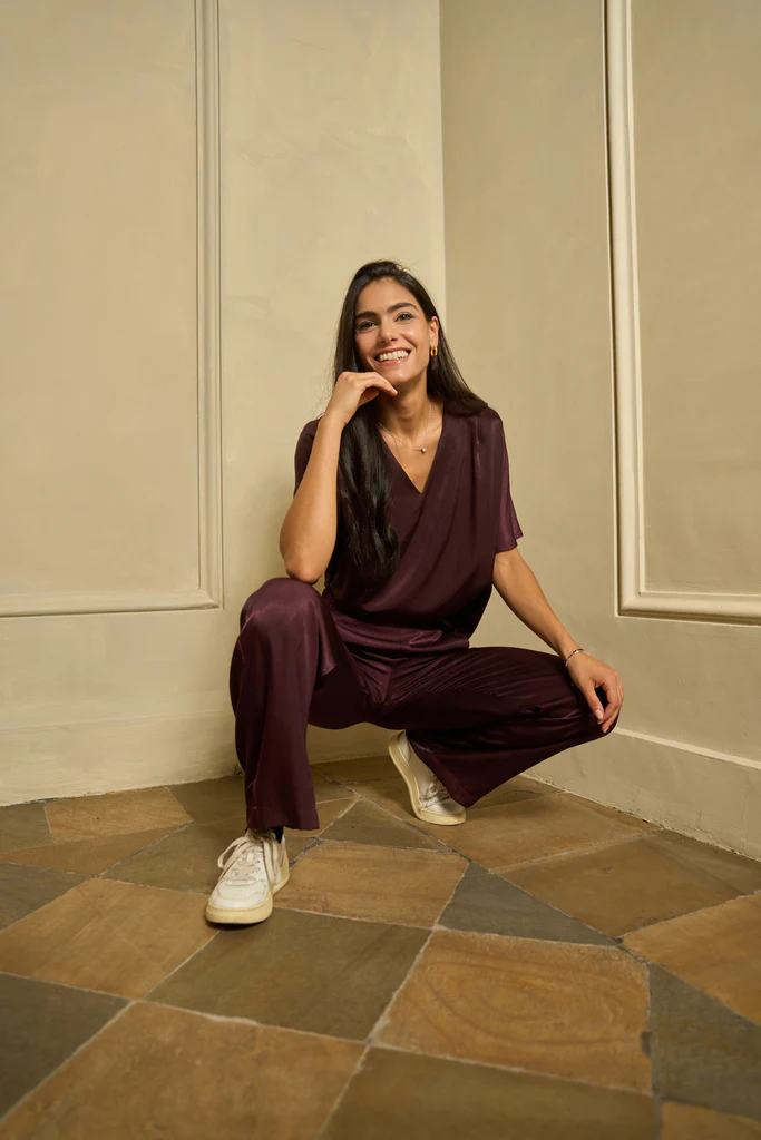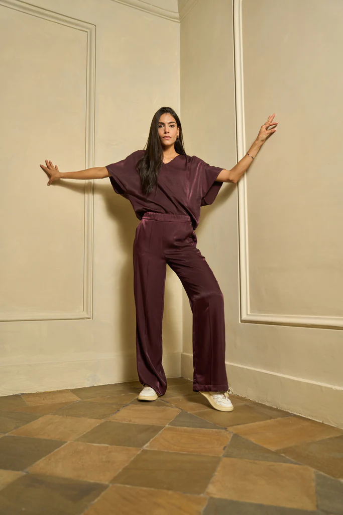 Maglia donna, con scollo a V e maniche corte ampie. Linea morbida e fluida, un capo elegante e versatile.