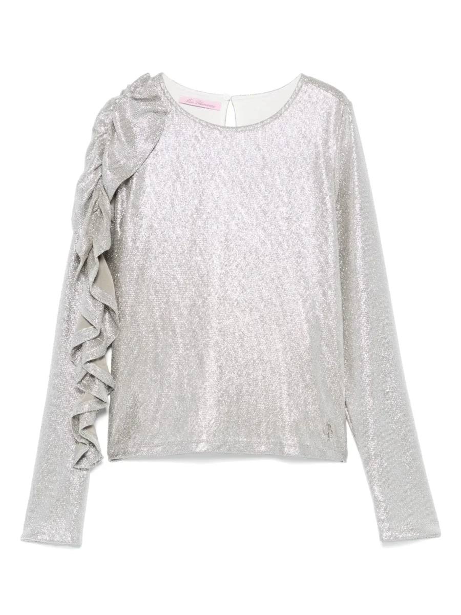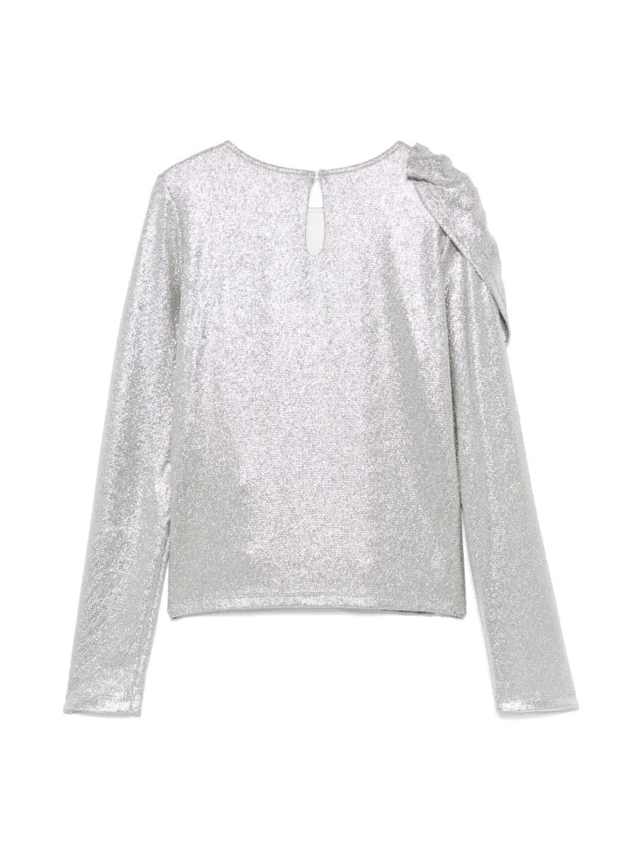 color argento trama jersey dettaglio con glitter scollo rotondo maniche lunghe dettaglio con ruches placca con logo color argento orlo dritto