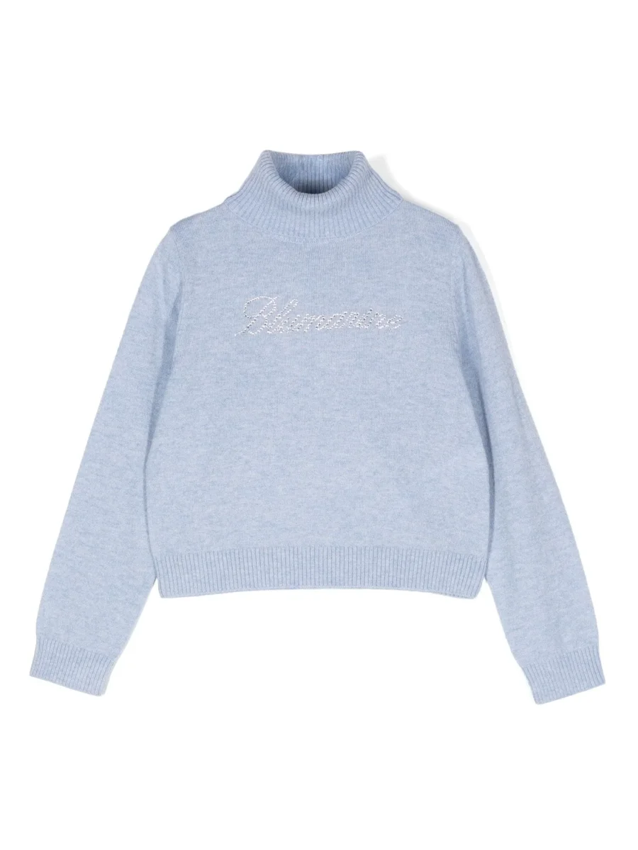 Maglione a collo alto Miss Blumarine realizzato in misto lana e cashmere di colore azzurro con logo Blumarine di strass sul petto. Finiture a costine.